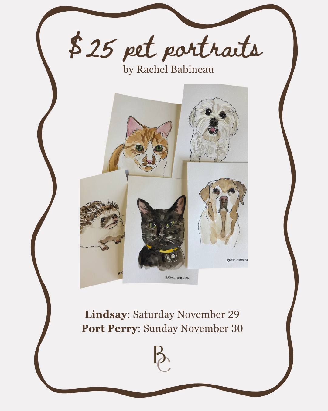 Join us in both our Lindsay and Port Perry locations for $25 pet portraits handcrafted on the spot by Rachel Babineau