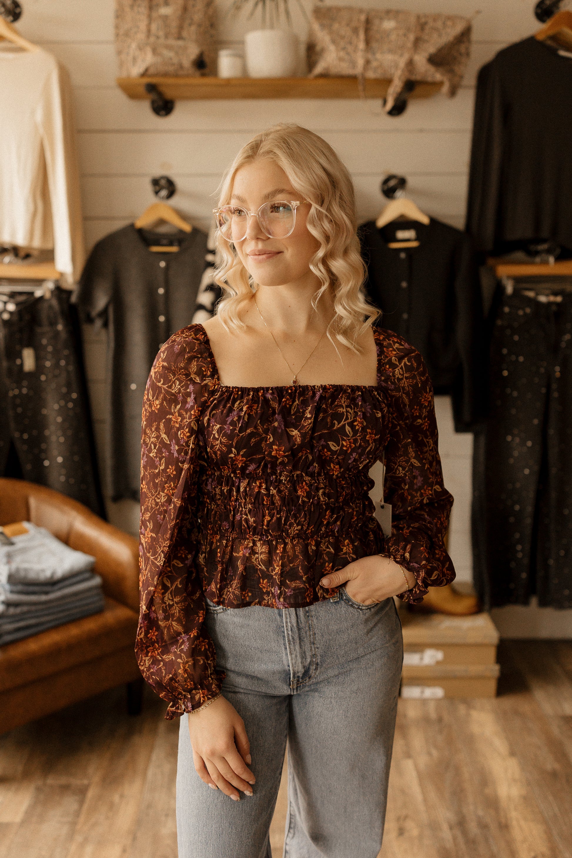 This blouse features a lively floral pattern, fluttery sleeves that add a touch of whimsy, and a comfy smocked bodice for a perfect fit.