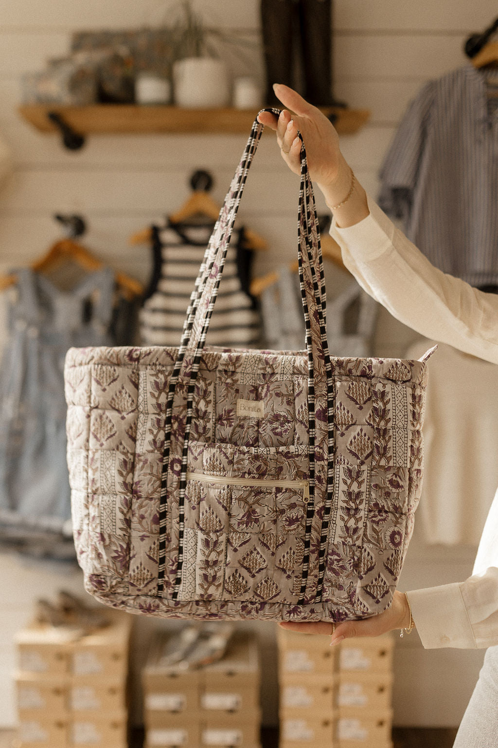 Bonita exclusive multi mini quilted tote bag. Featuring a zip closure, a small inside zip pocket and carrying straps.