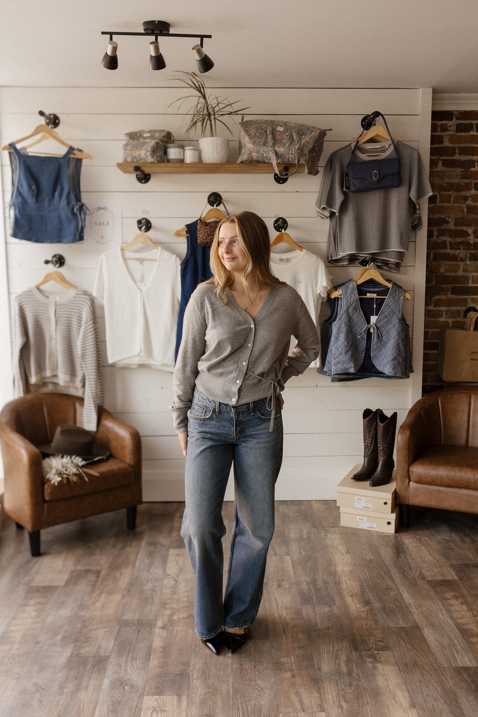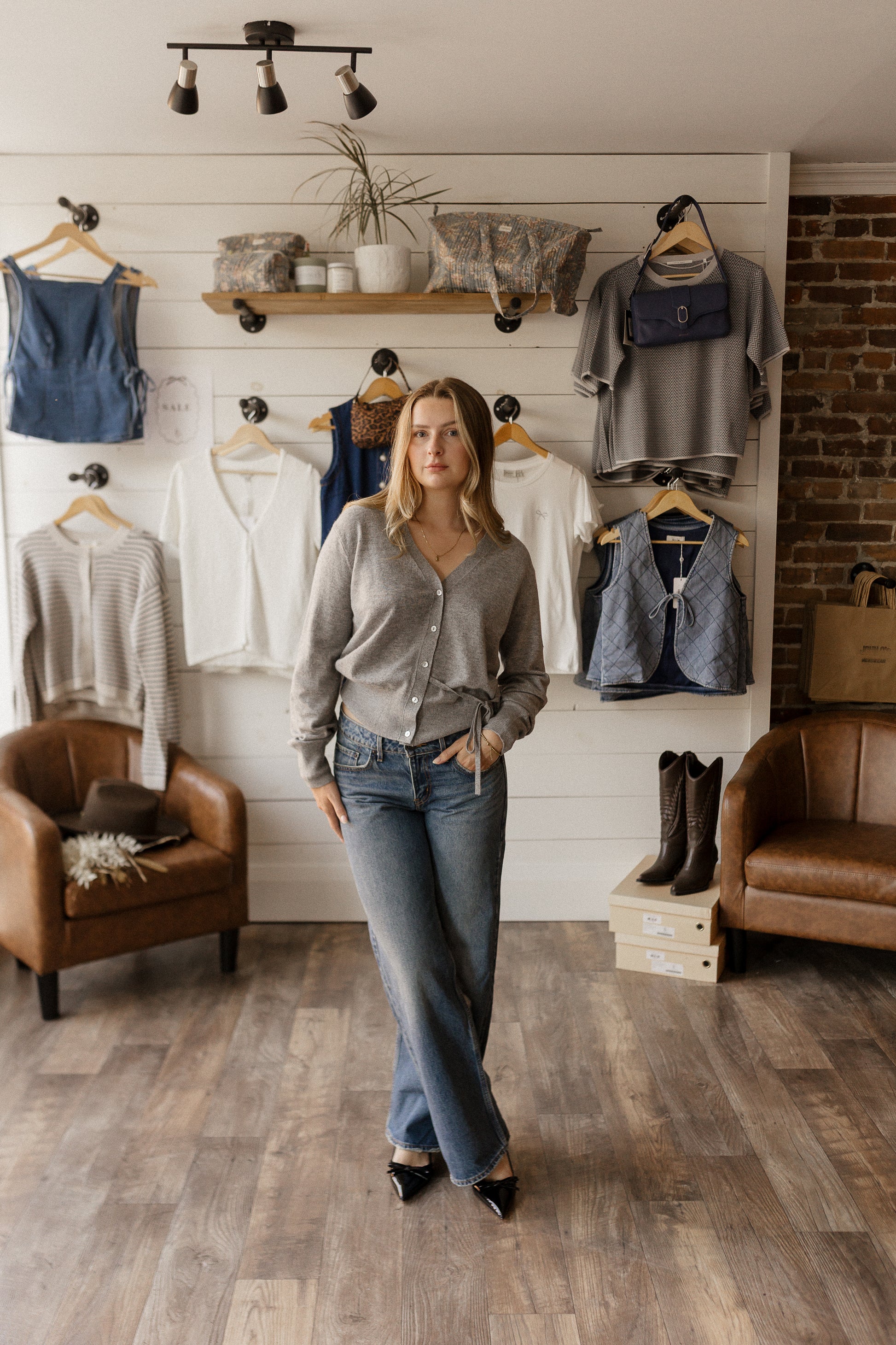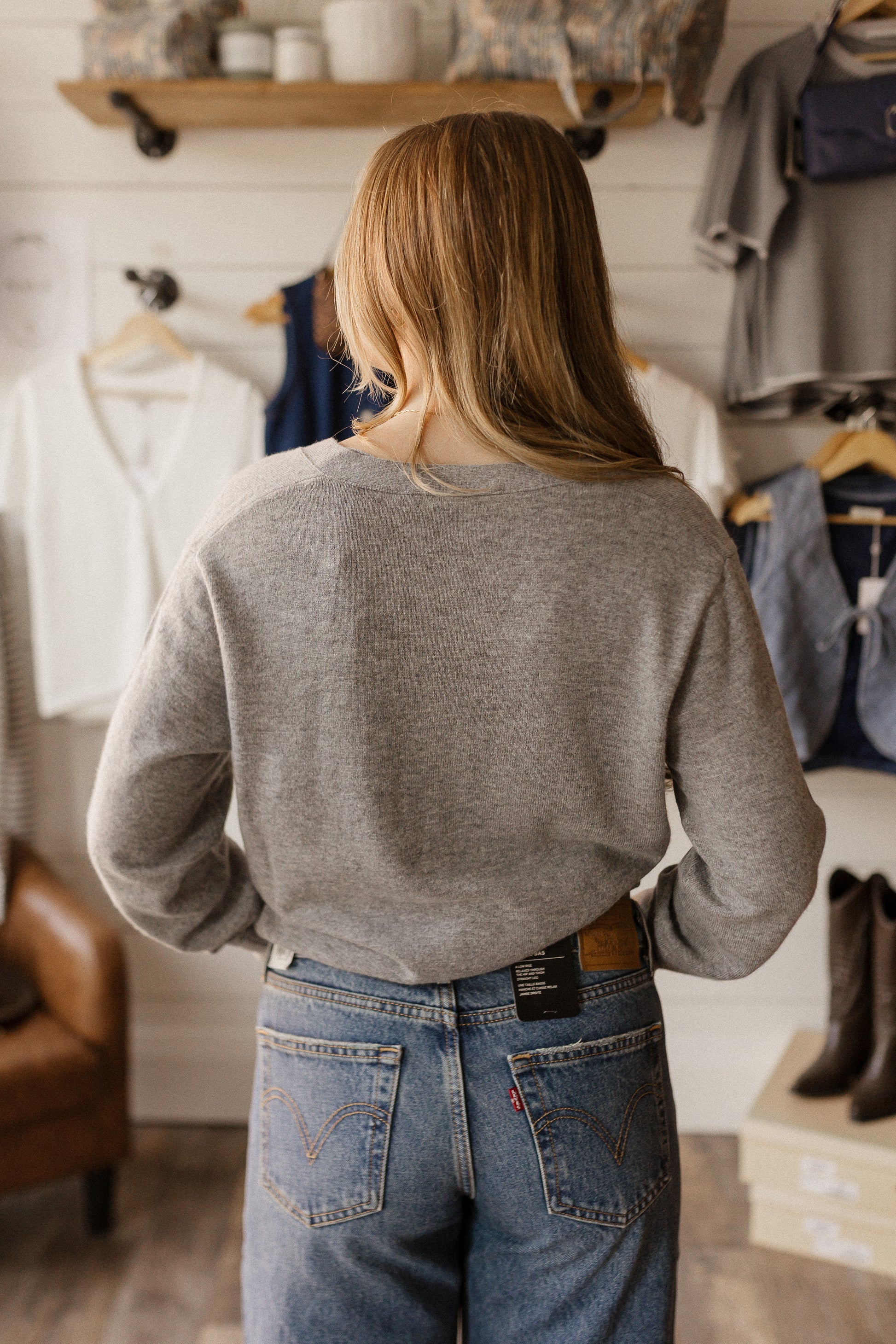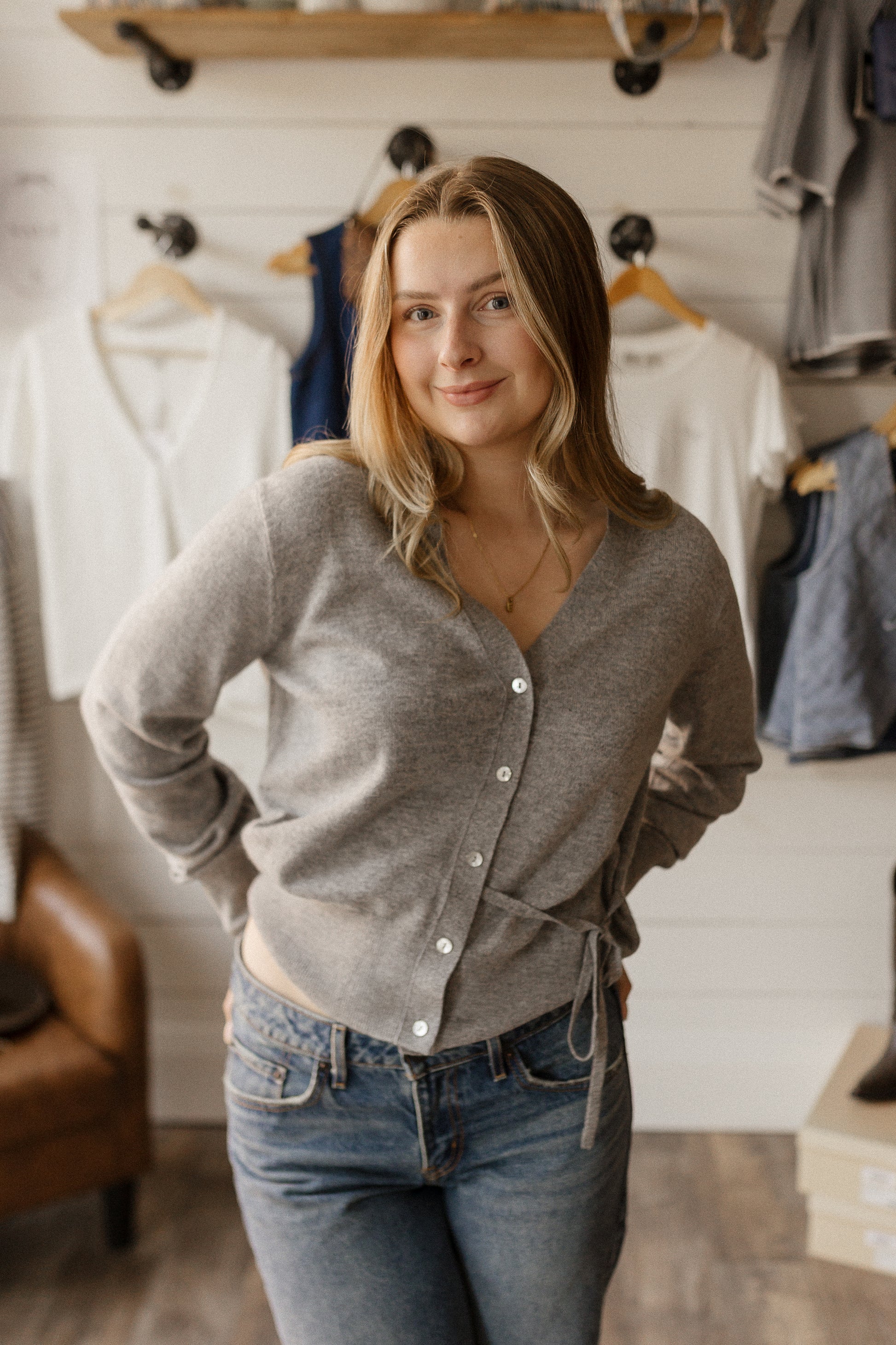 light grey cardigan with dainty tie details.