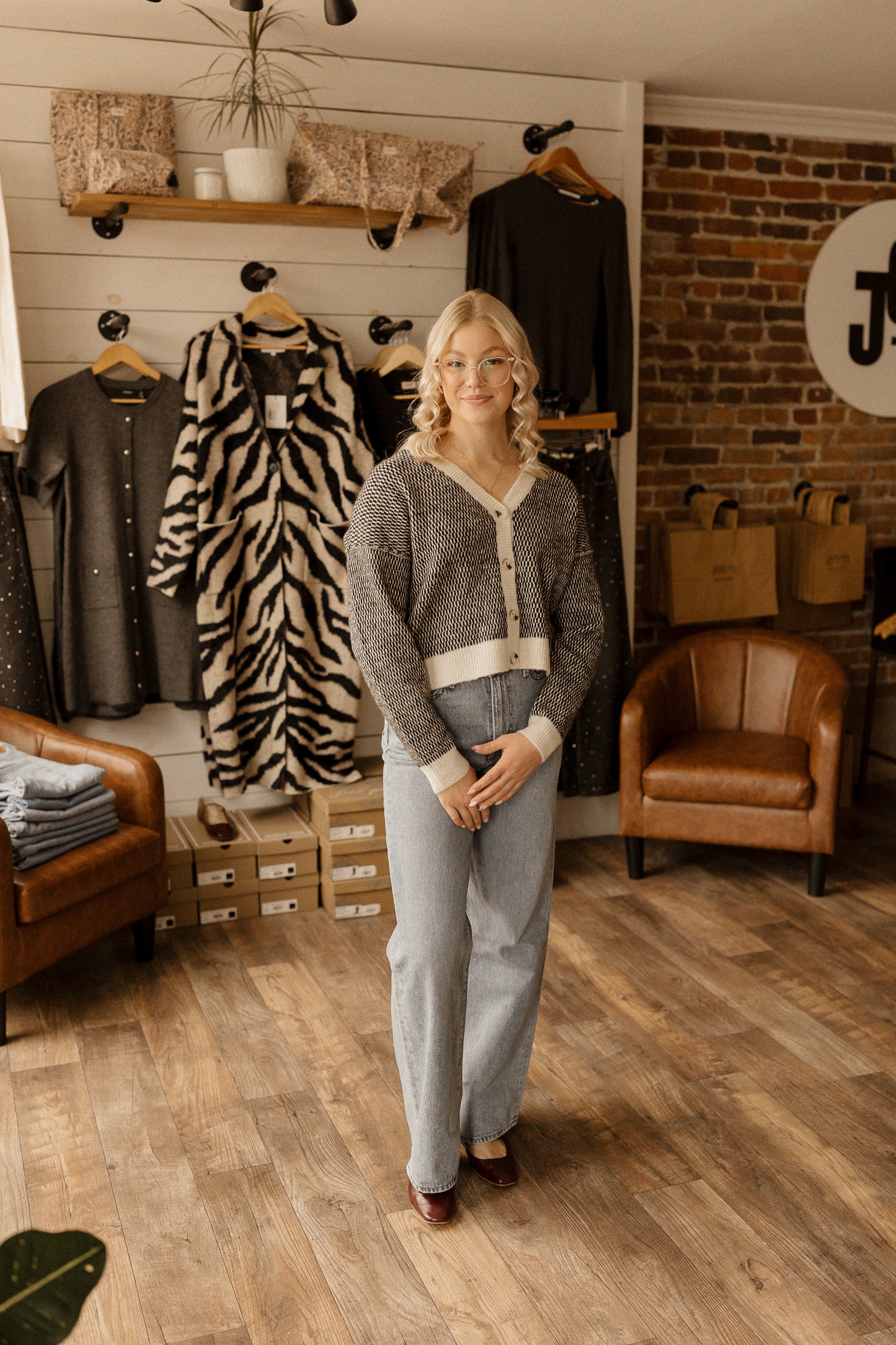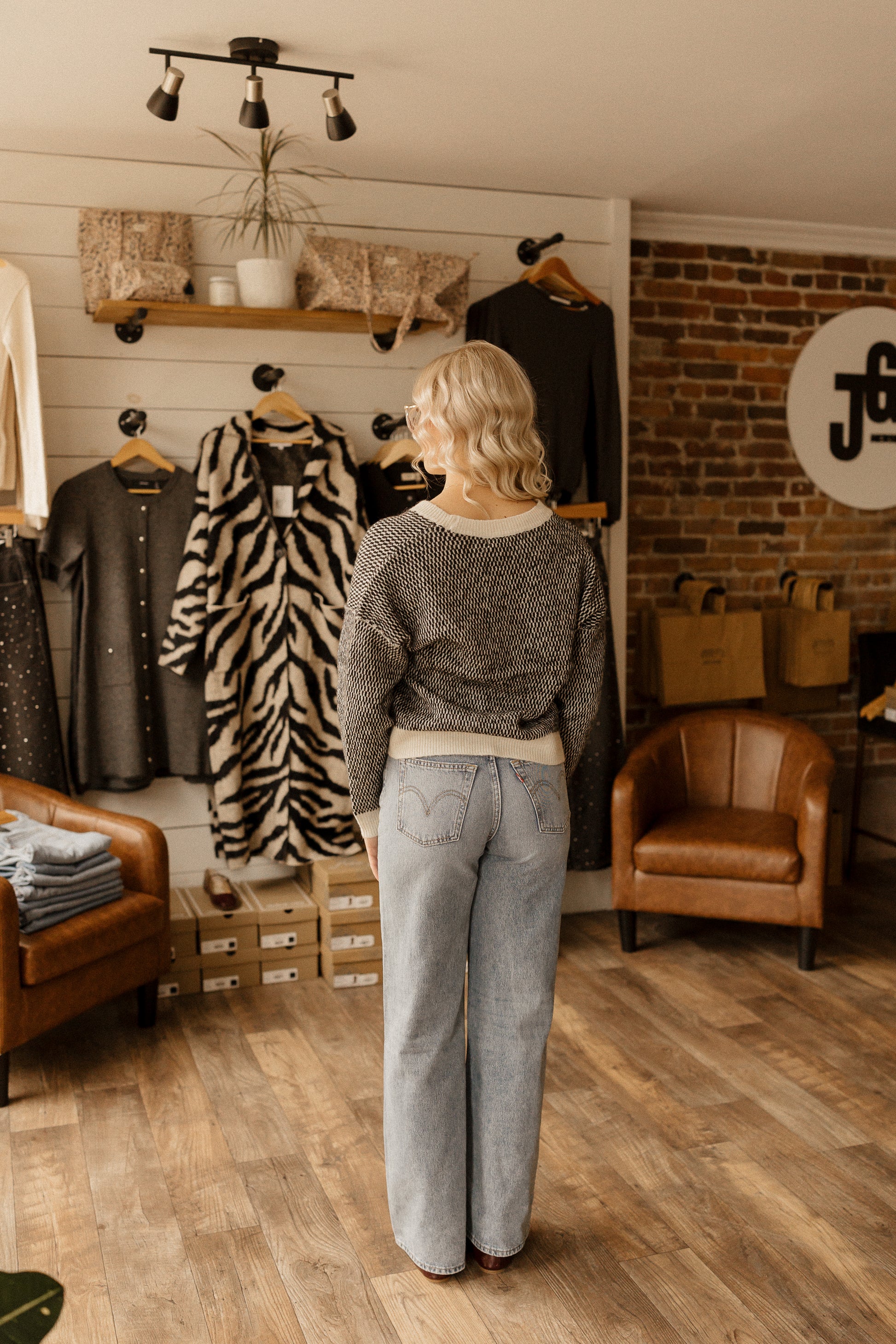 This cozy sweater features black and white stitching with a charming white collar and hem that add a fun contrast to your outfit.