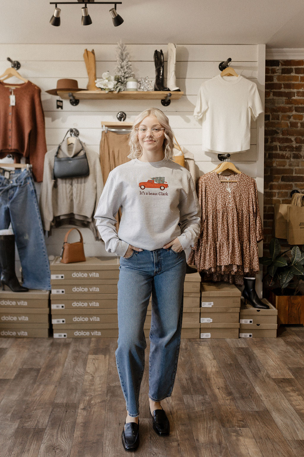 'it's a beaut Clark' embroidered crewneck in heather grey. This sweater is super cozy and festive for the holidays.