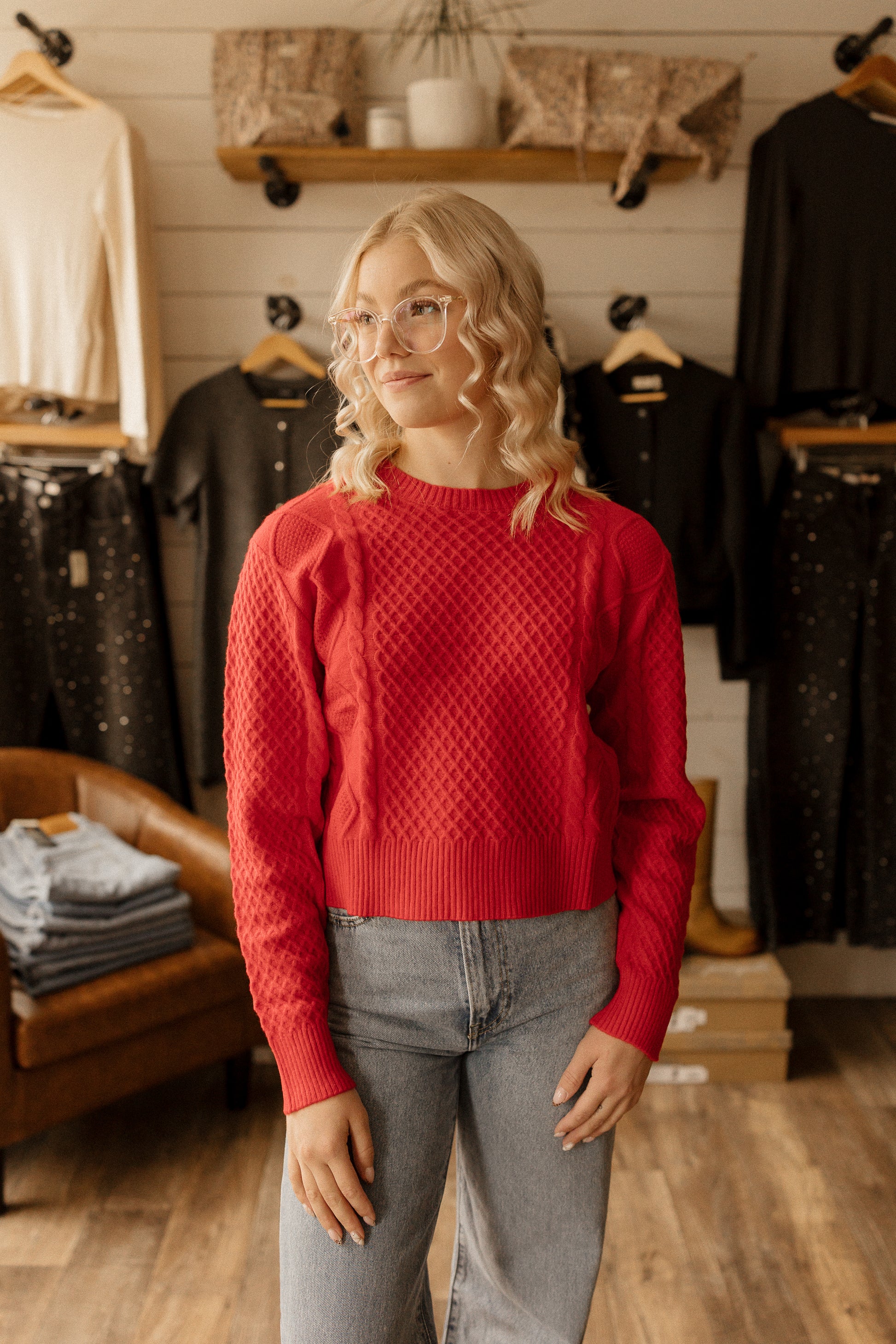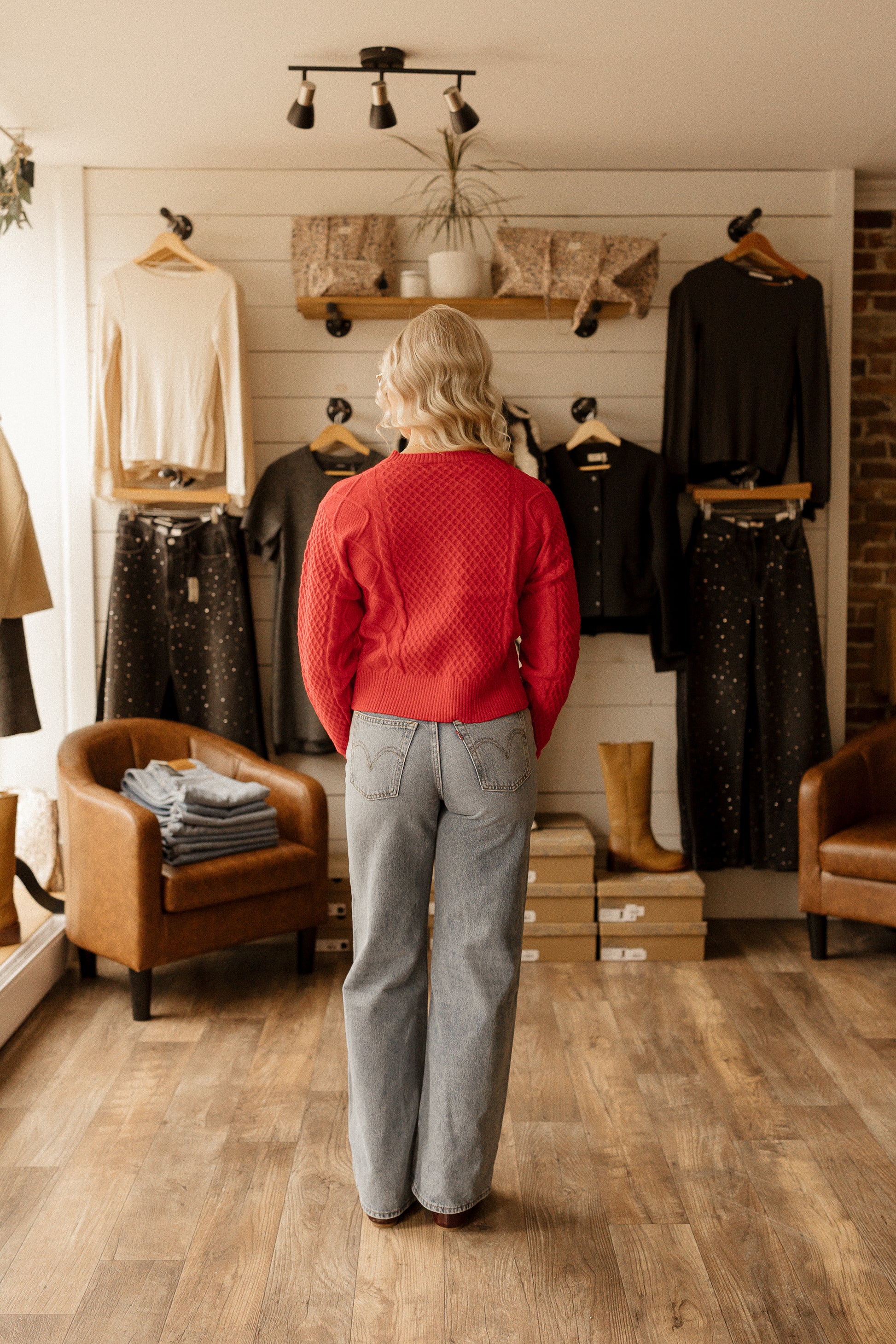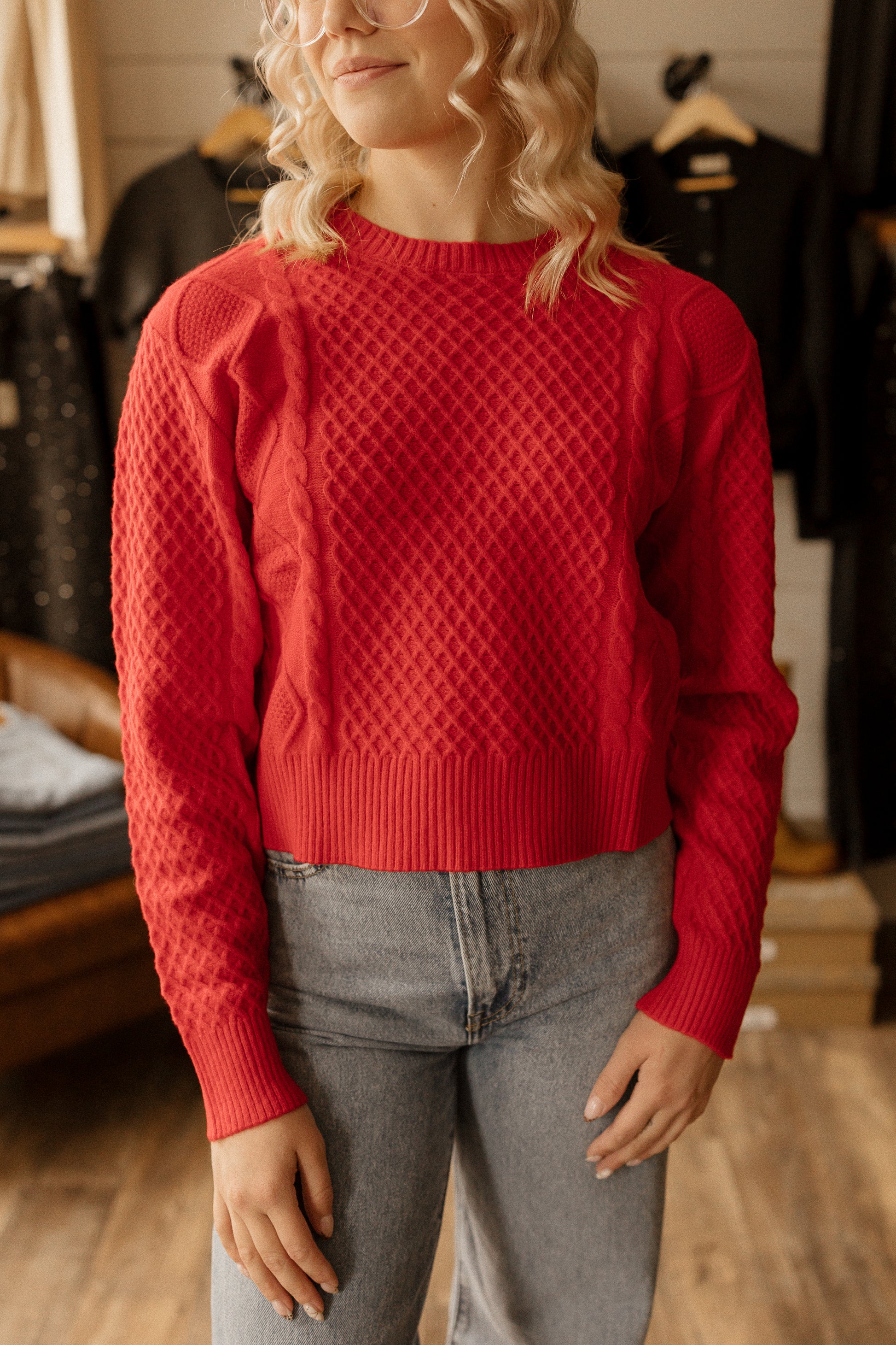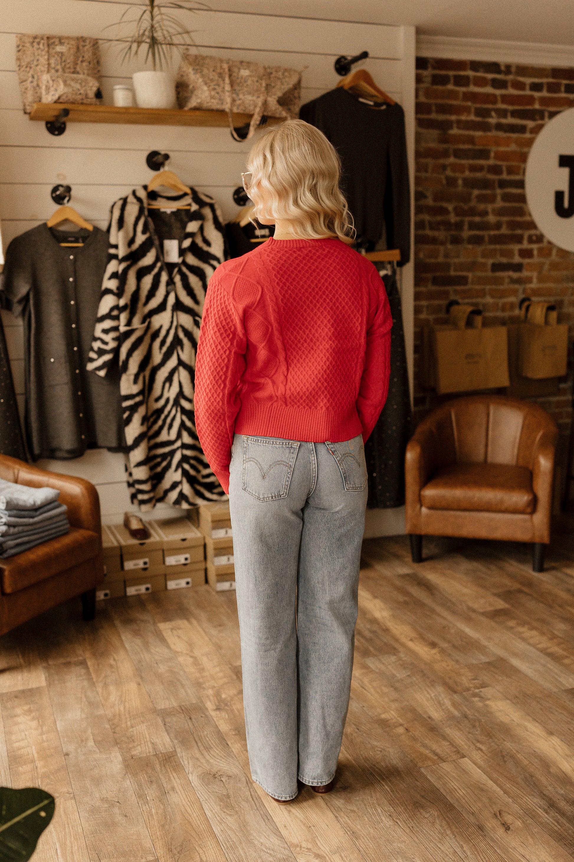 This cozy sweater comes in a lively poppy shade that's perfect for adding a splash of fun to your wardrobe.