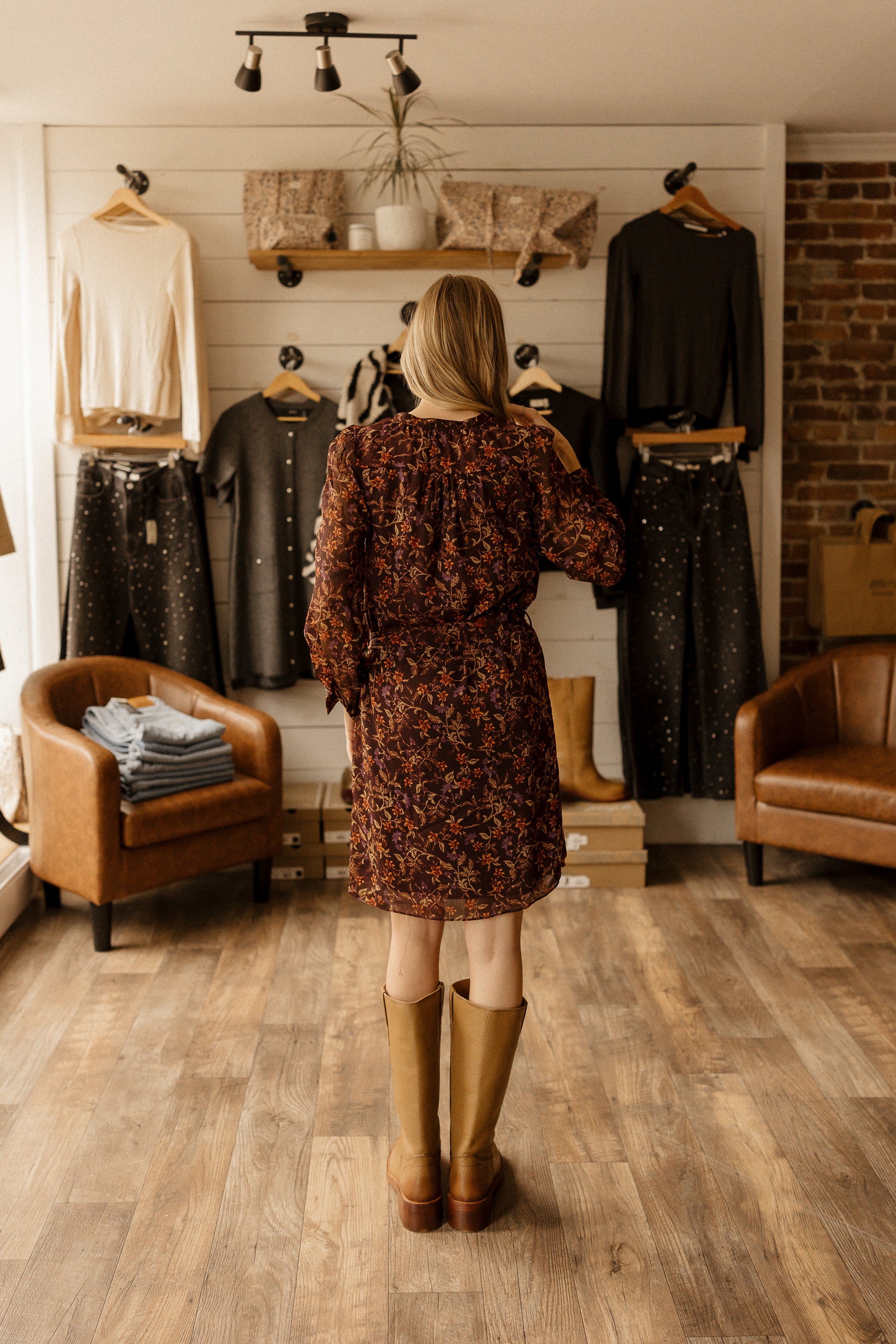 This burgundy floral dress features fluttery sleeves and a waist belt that cinches in for a fun, flirty fit.