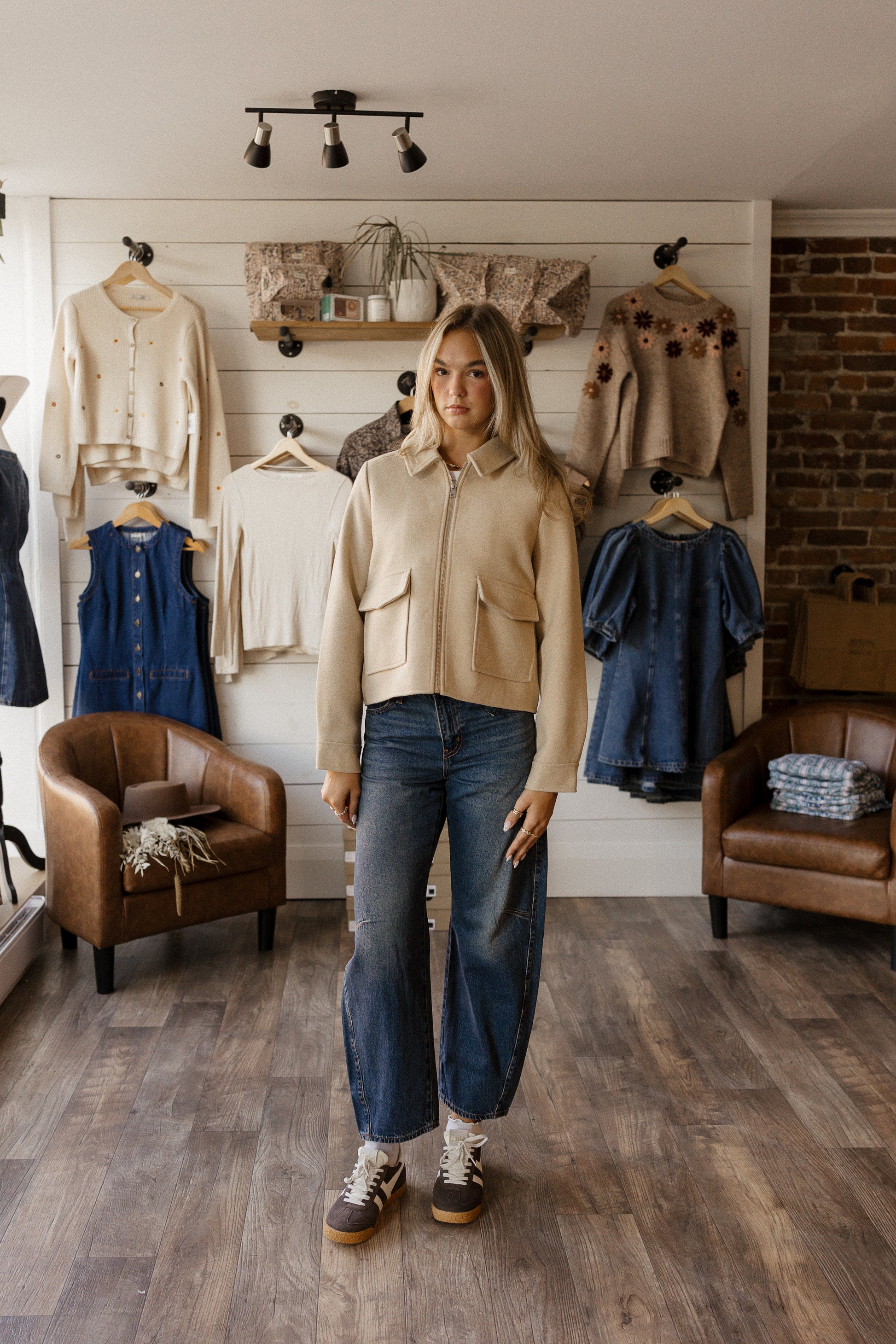 neutral crop jacket with two front pockets, collar and a zip closure.
