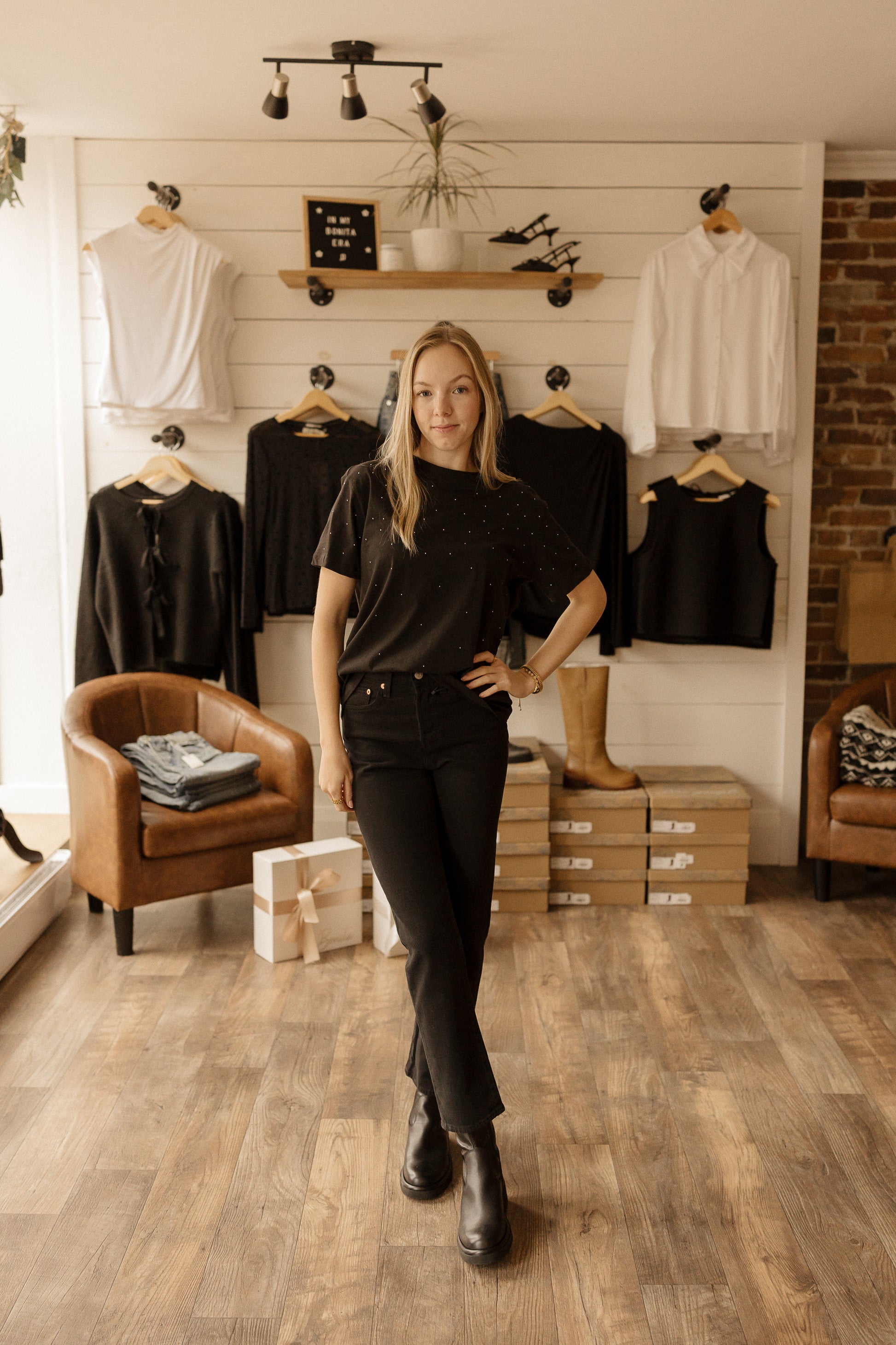 Ready to make your basics pop? The Kinsley tee takes the timeless black staple and kicks it up a notch with gorgeous sparkle accents that catch the light beautifully.