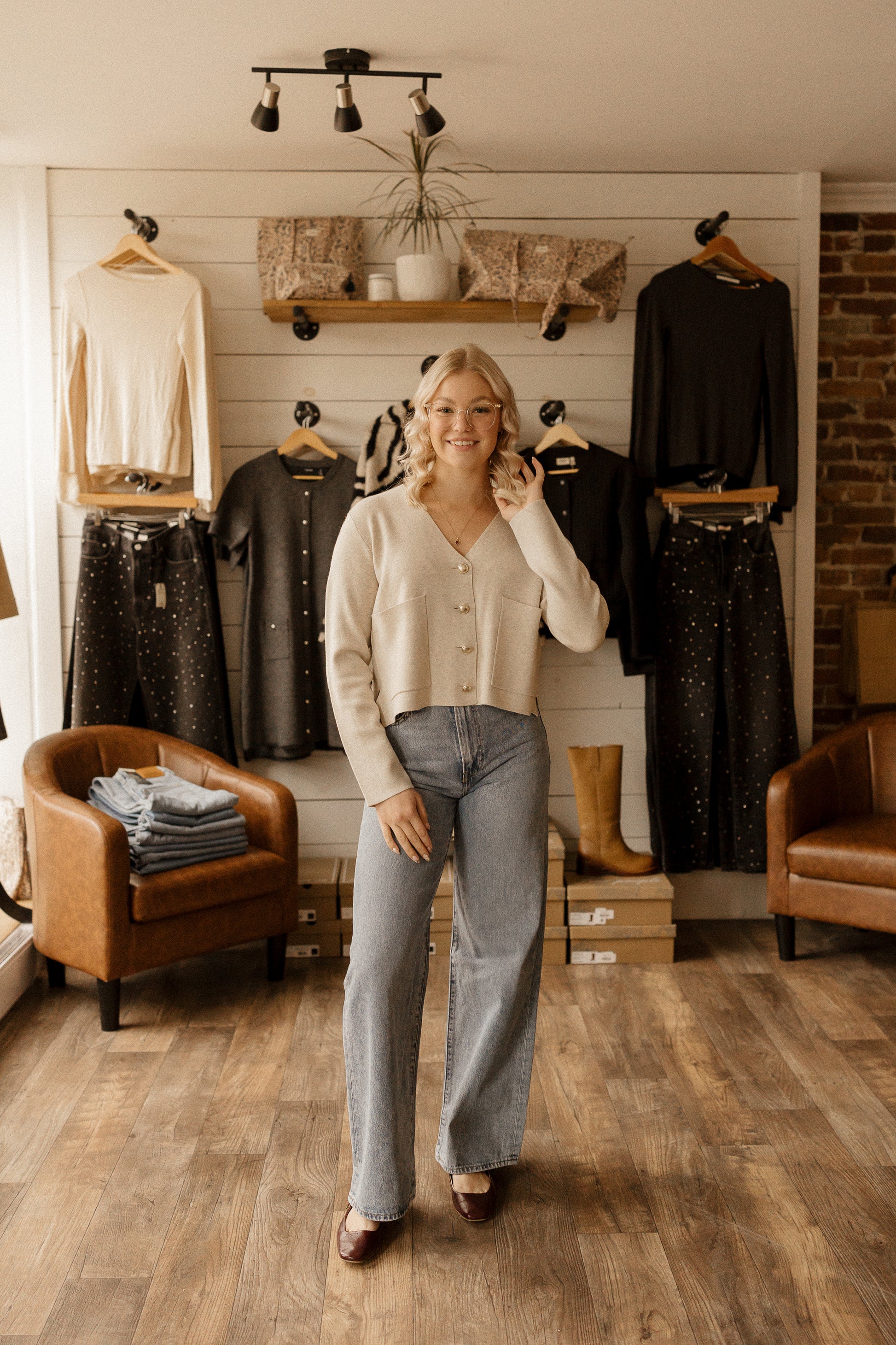 LUXE cardigan sweater with a smooth feel featuring front detail buttons and front pockets