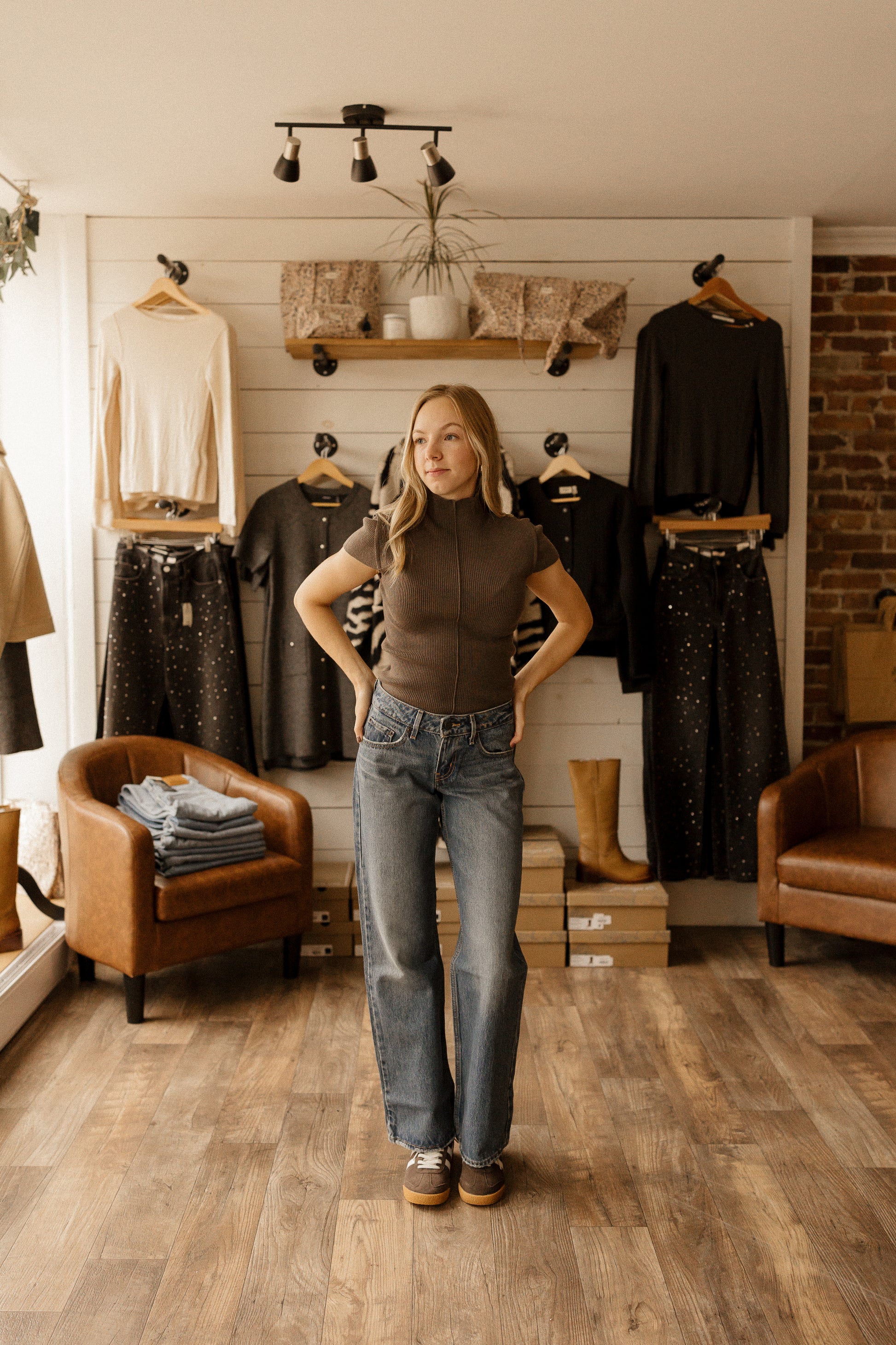 Charcoal grey ribbed fitted sweater shirt with a front seam for detailing.