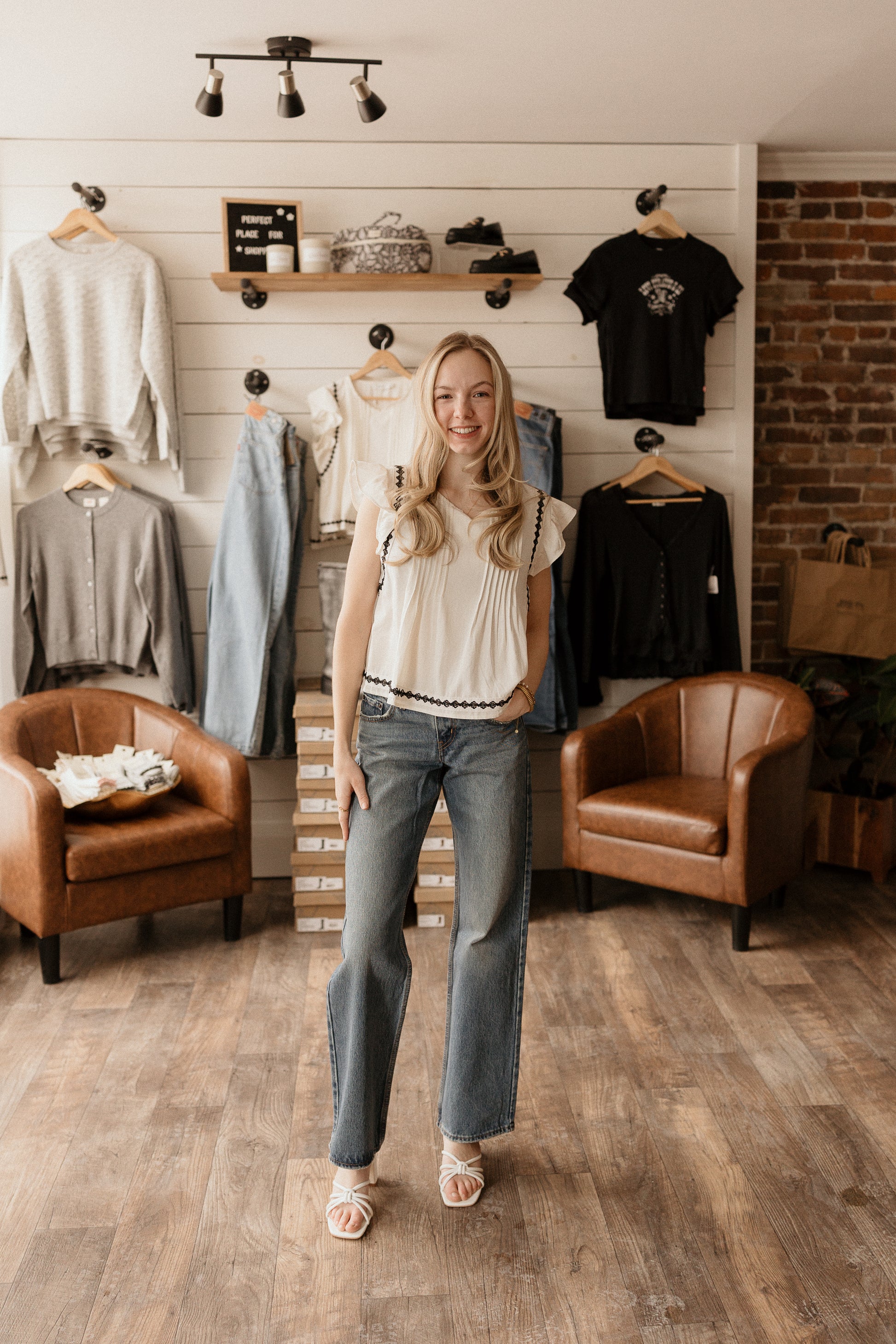 Ivory blouse with black hem detailing and ruffle sleeves.