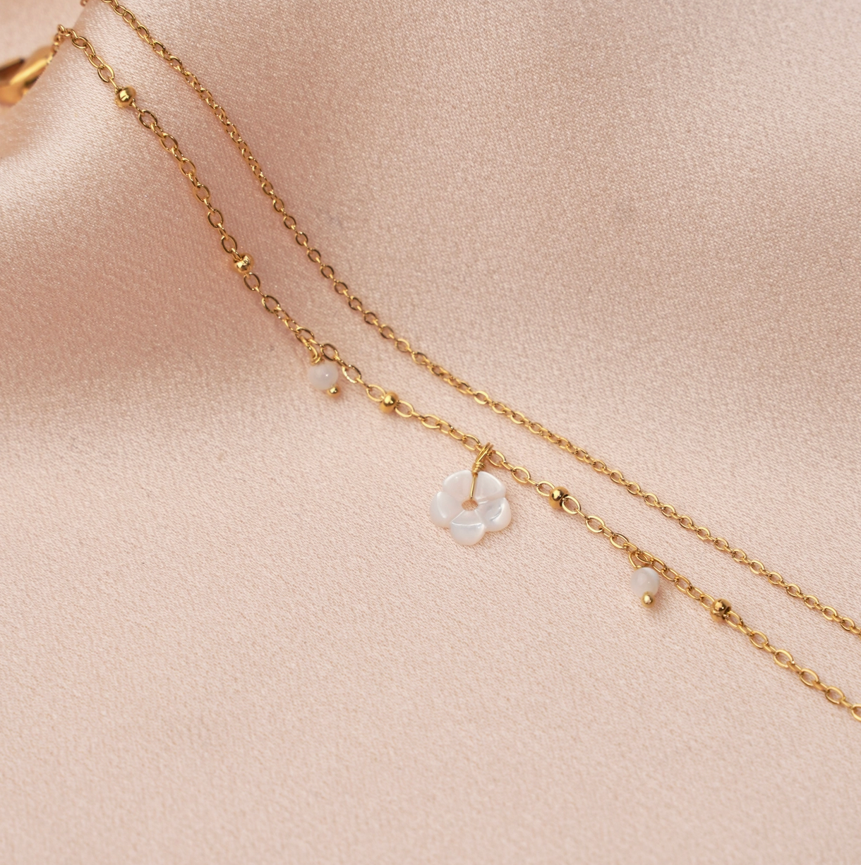 This women's bracelet is composed of a fine stainless steel chain on which pearls and a white mother-of-pearl flower are mounted. The bracelet has a small 3cm adjustment chain, so it adapts to the size of your wrist. So it is perfect for giving as a gift. It goes very well with other small gold bracelets.