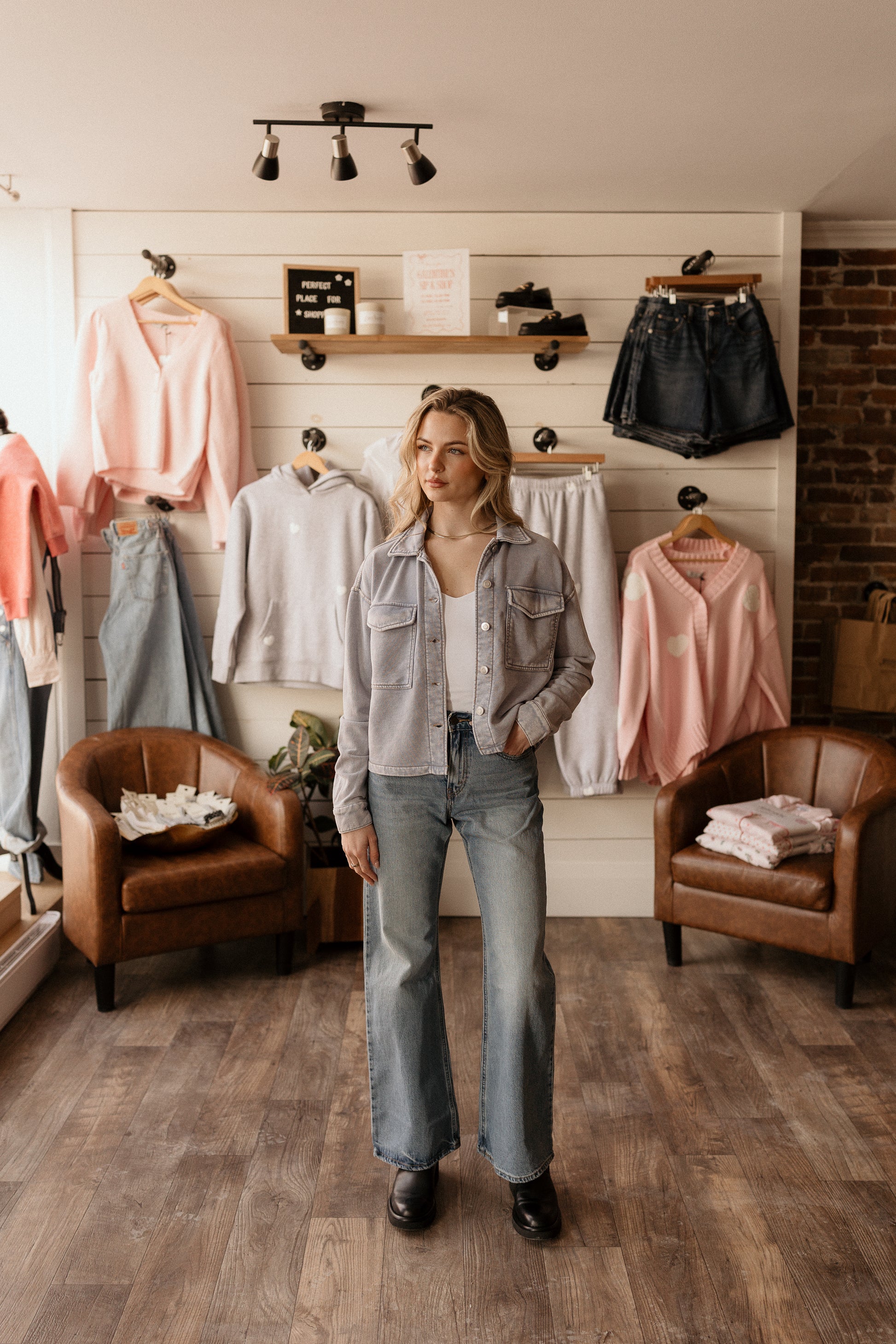 material denim shirt with front buttons and pockets.