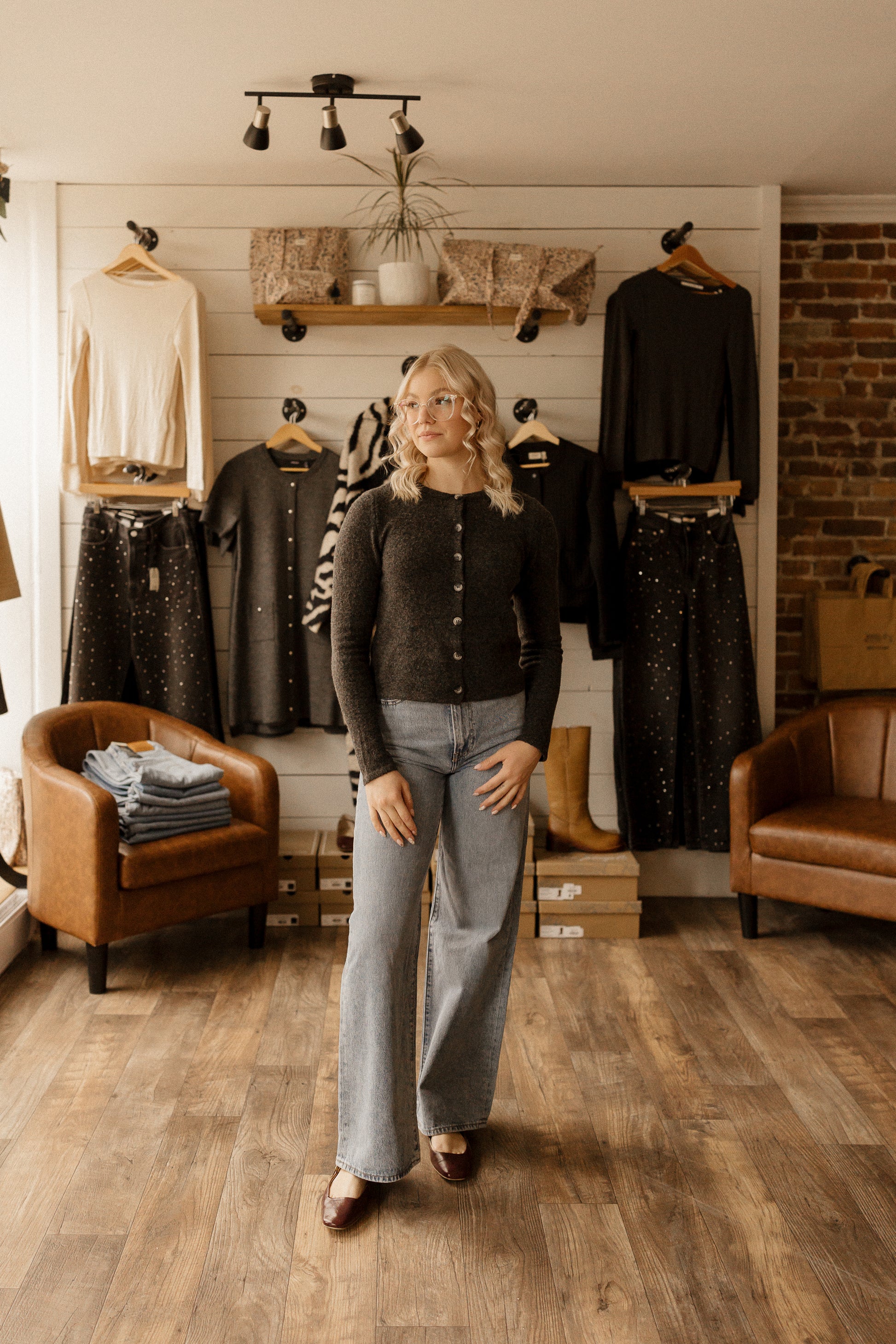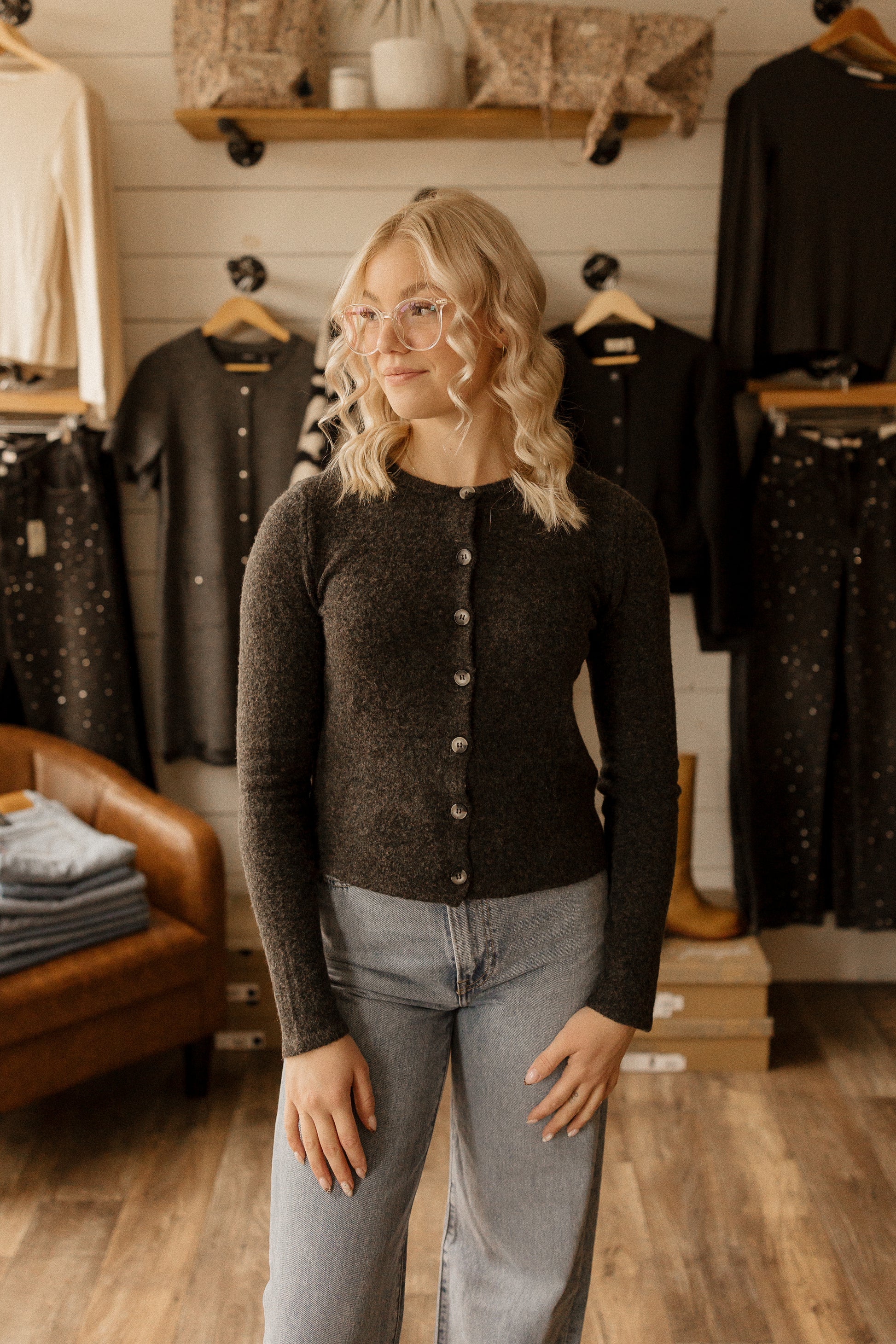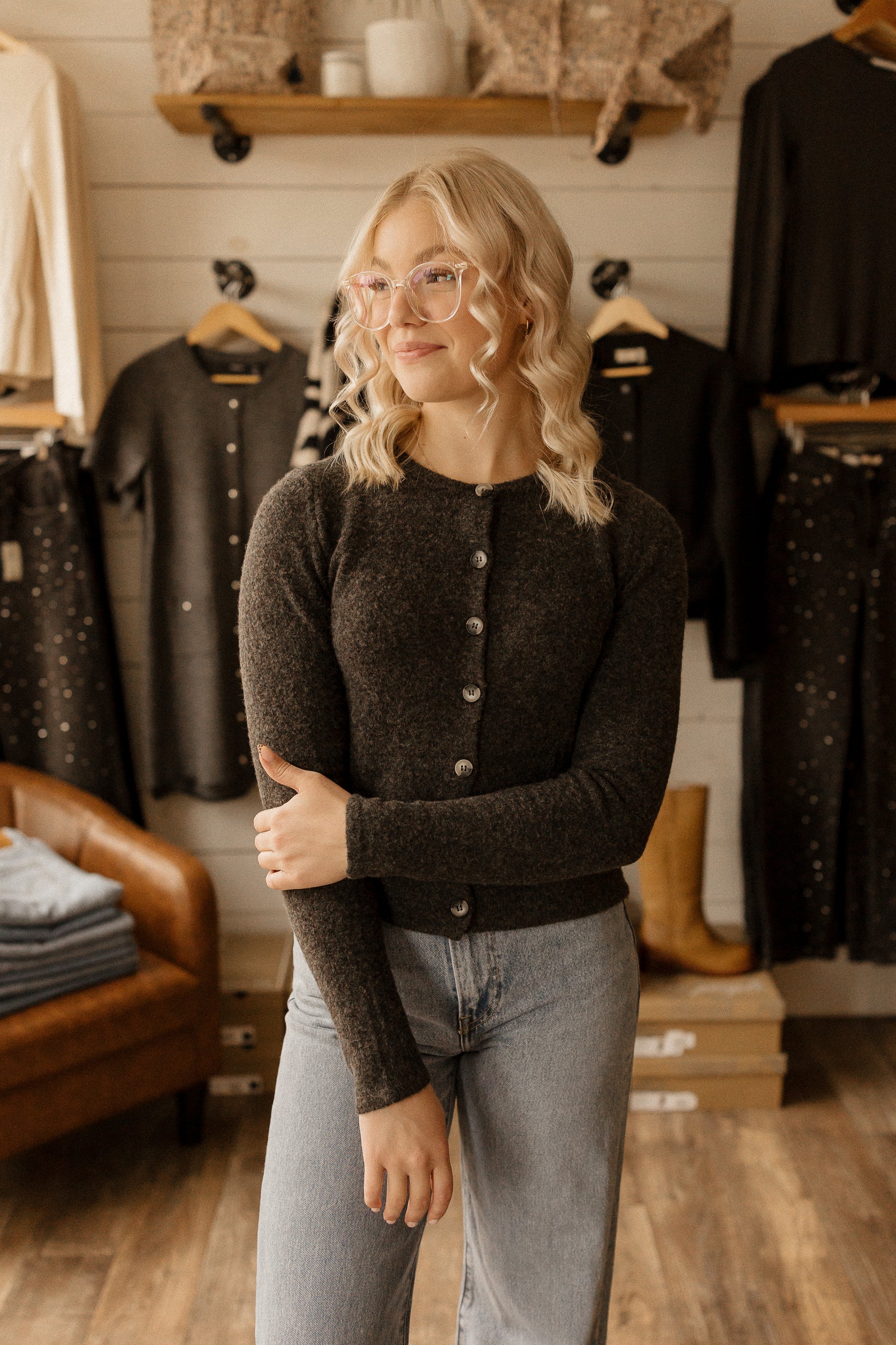 This charcoal cardigan is your go-to cozy layer buddy for any outfit.