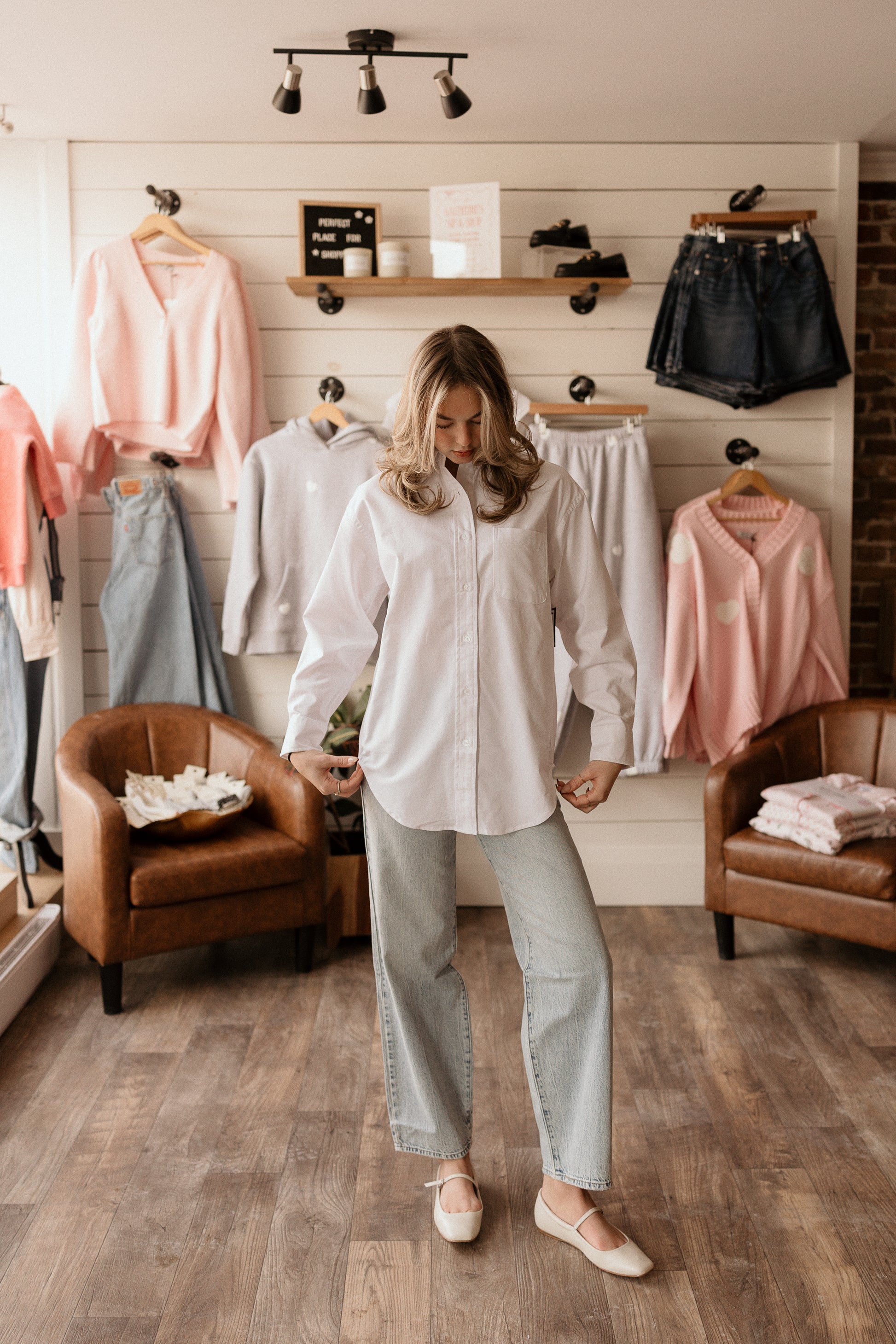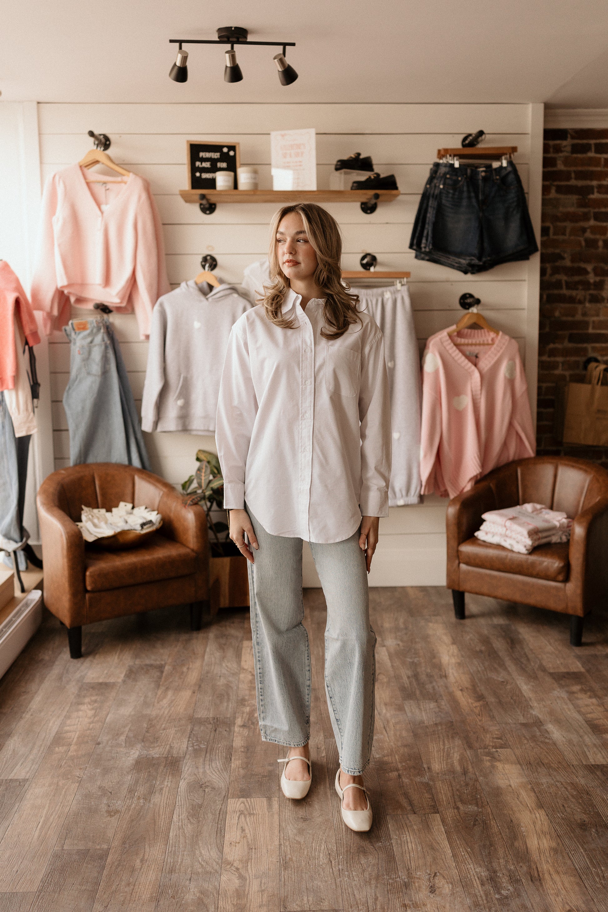 Crisp white oxford shirt with classic button-front styling. Perfect for layering, dressing up casual looks, or creating that effortlessly polished vibe. A wardrobe essential that works as hard as you do.