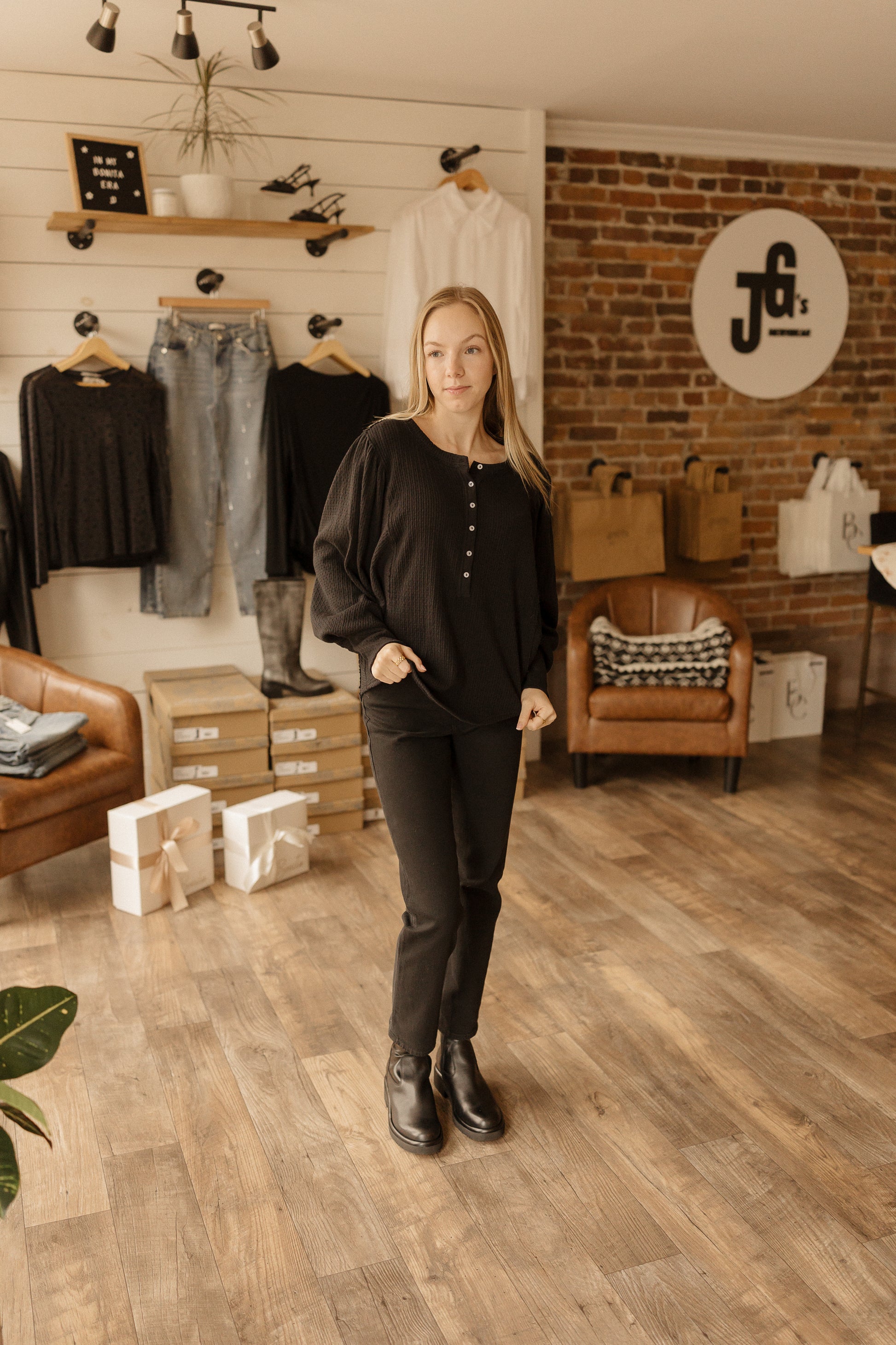 Introducing the Quinn — a chic black waffle-knit top that's equal parts cozy and put-together. Featuring front buttons and fitted sleeves that hug just right, this Free People piece is your new go-to for effortless style.
