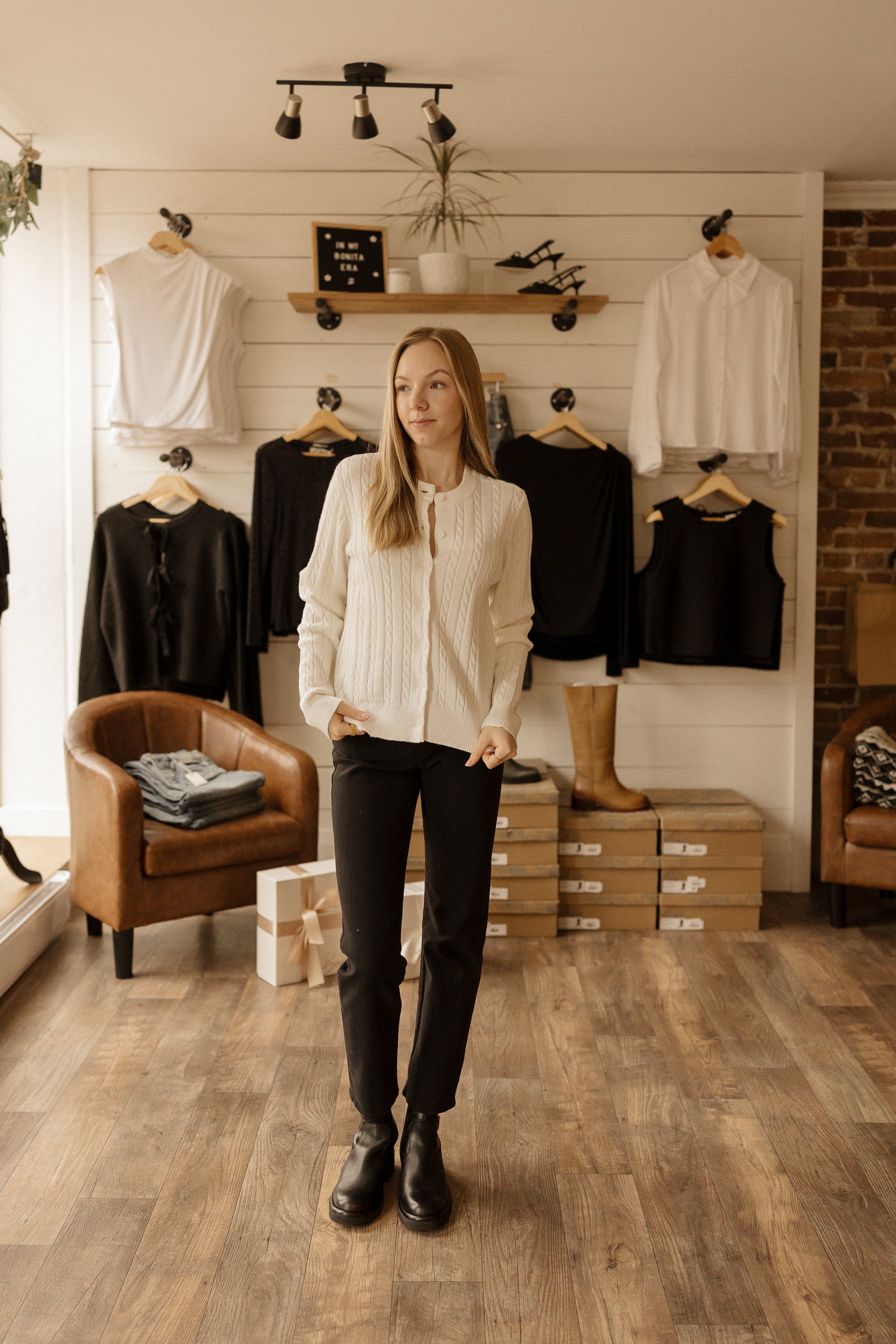 Cozy up in this creamy white knit cardigan that's perfect for layering through the chilly months. Soft, versatile, and effortlessly chic—your new go-to piece for staying warm with style.