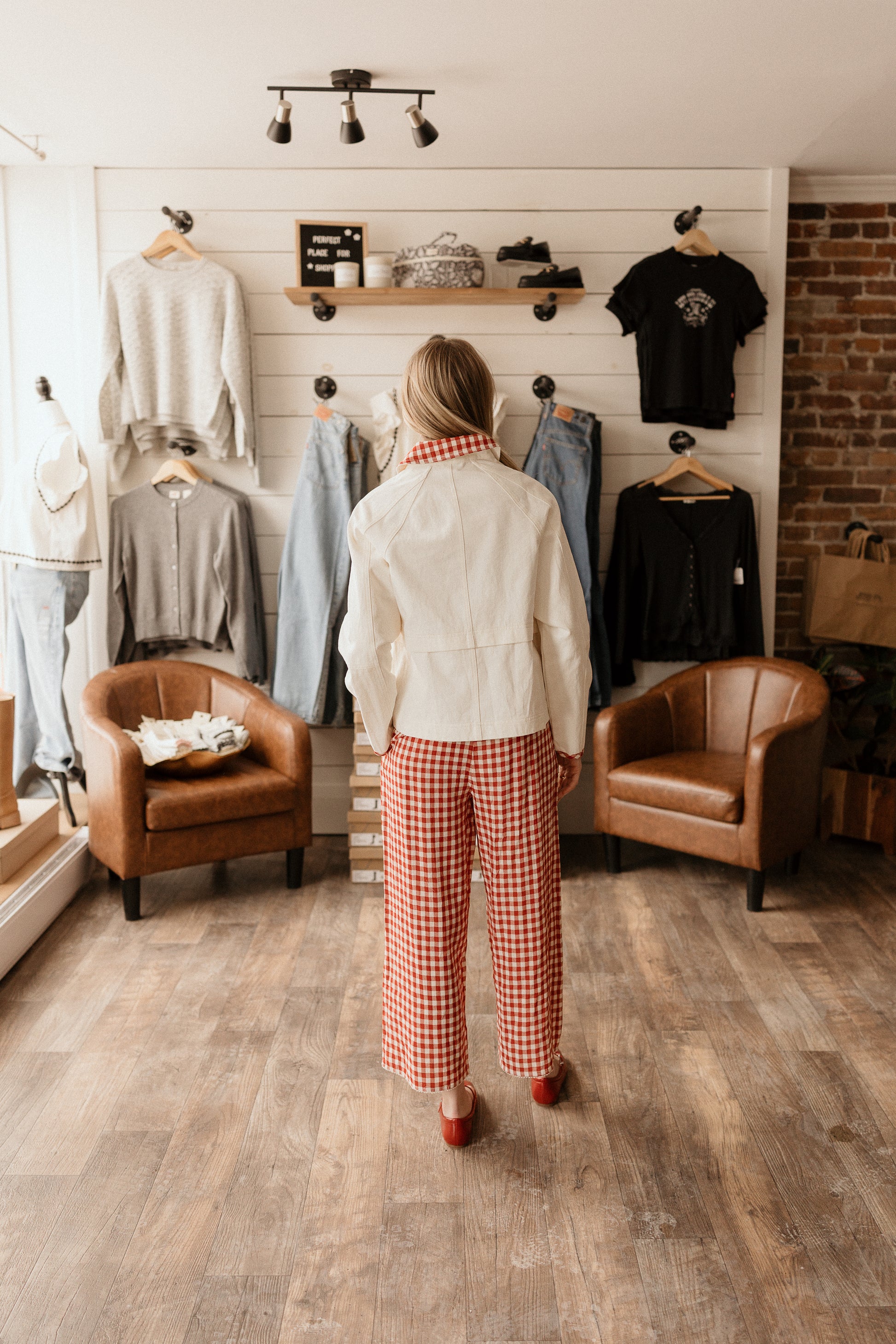 Red and ivory gingham trousers with a tie waistband. A cropped look.