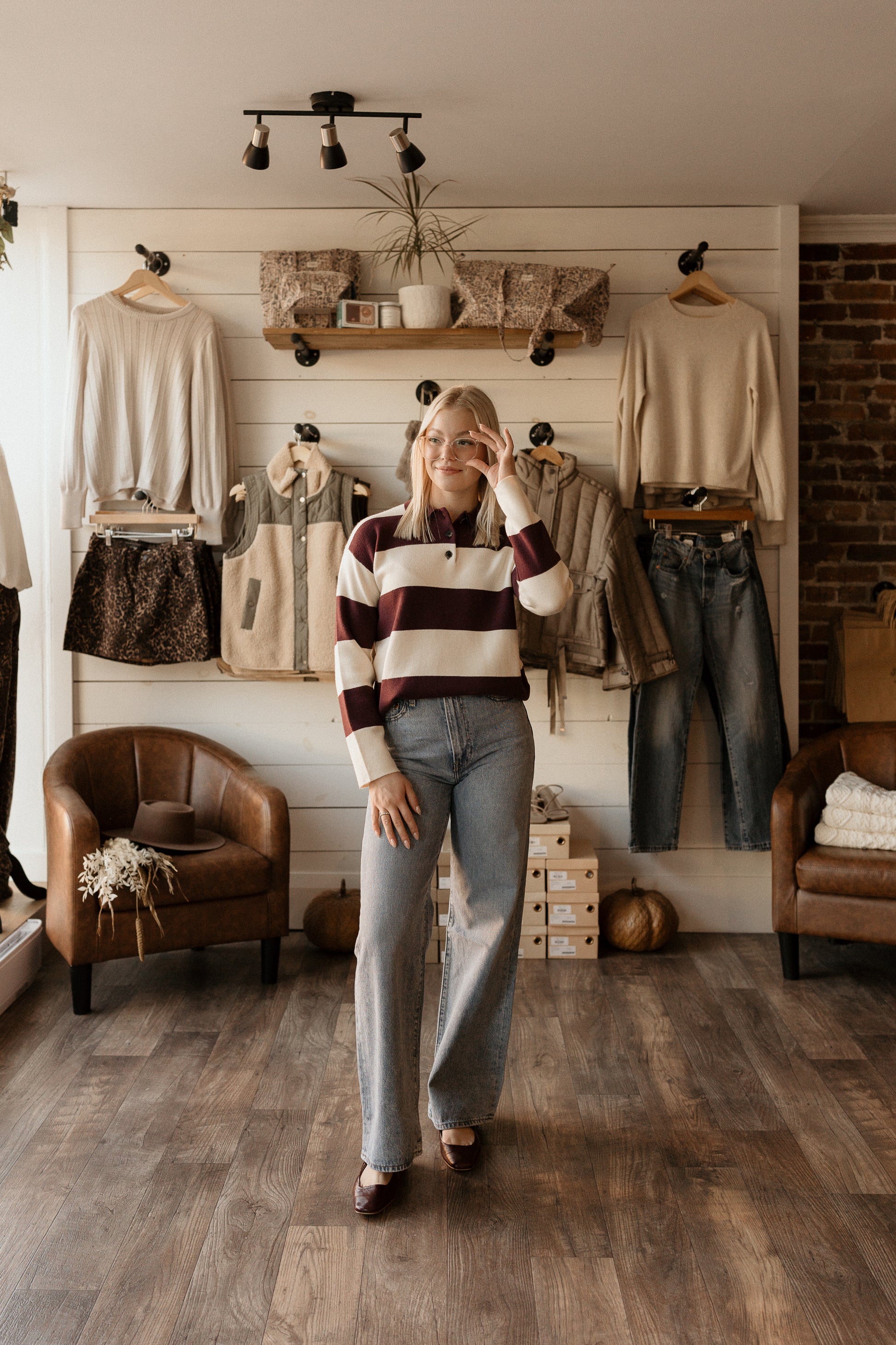 Wine tasting and birch striped rugby polo with a collar.