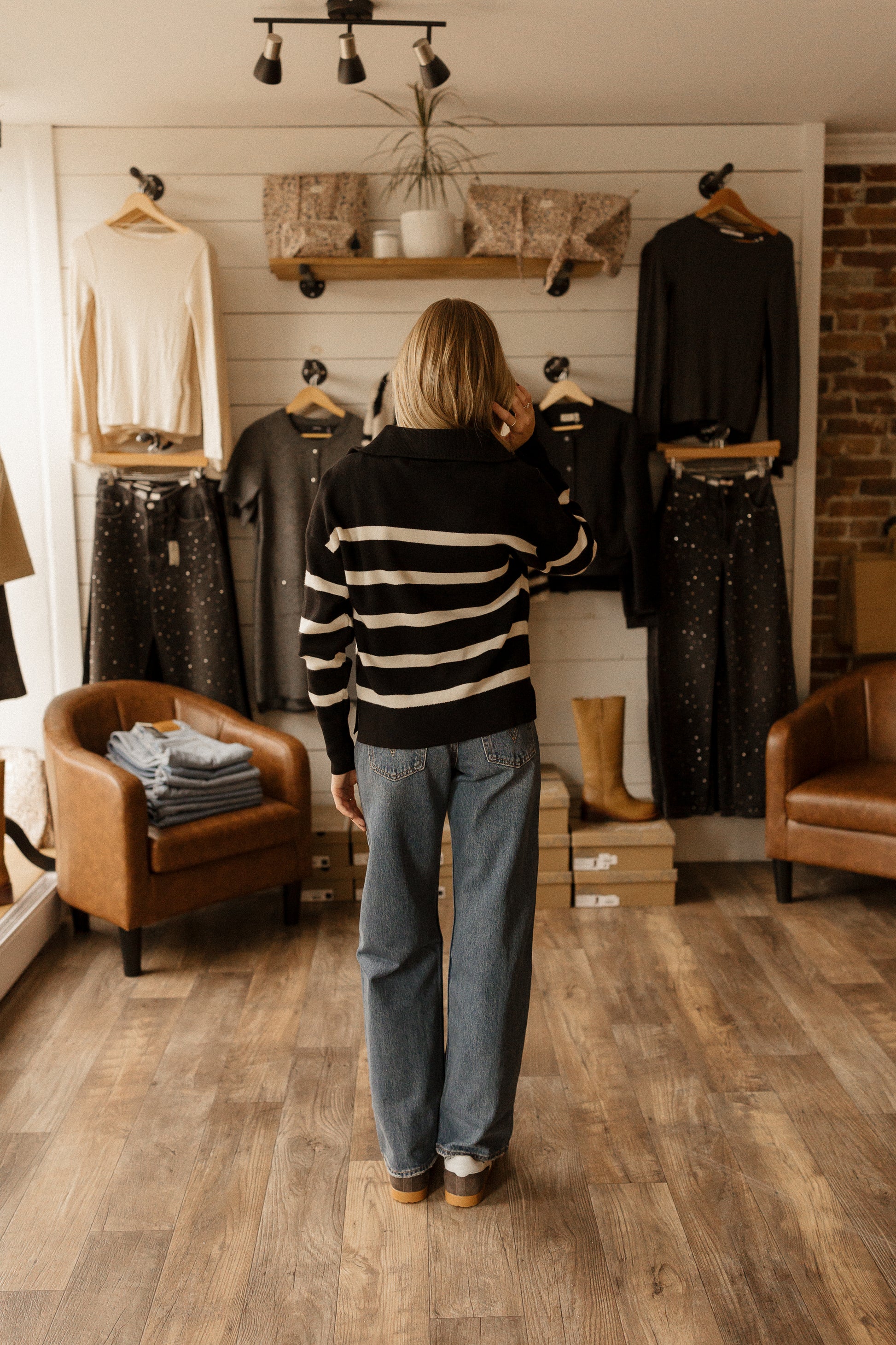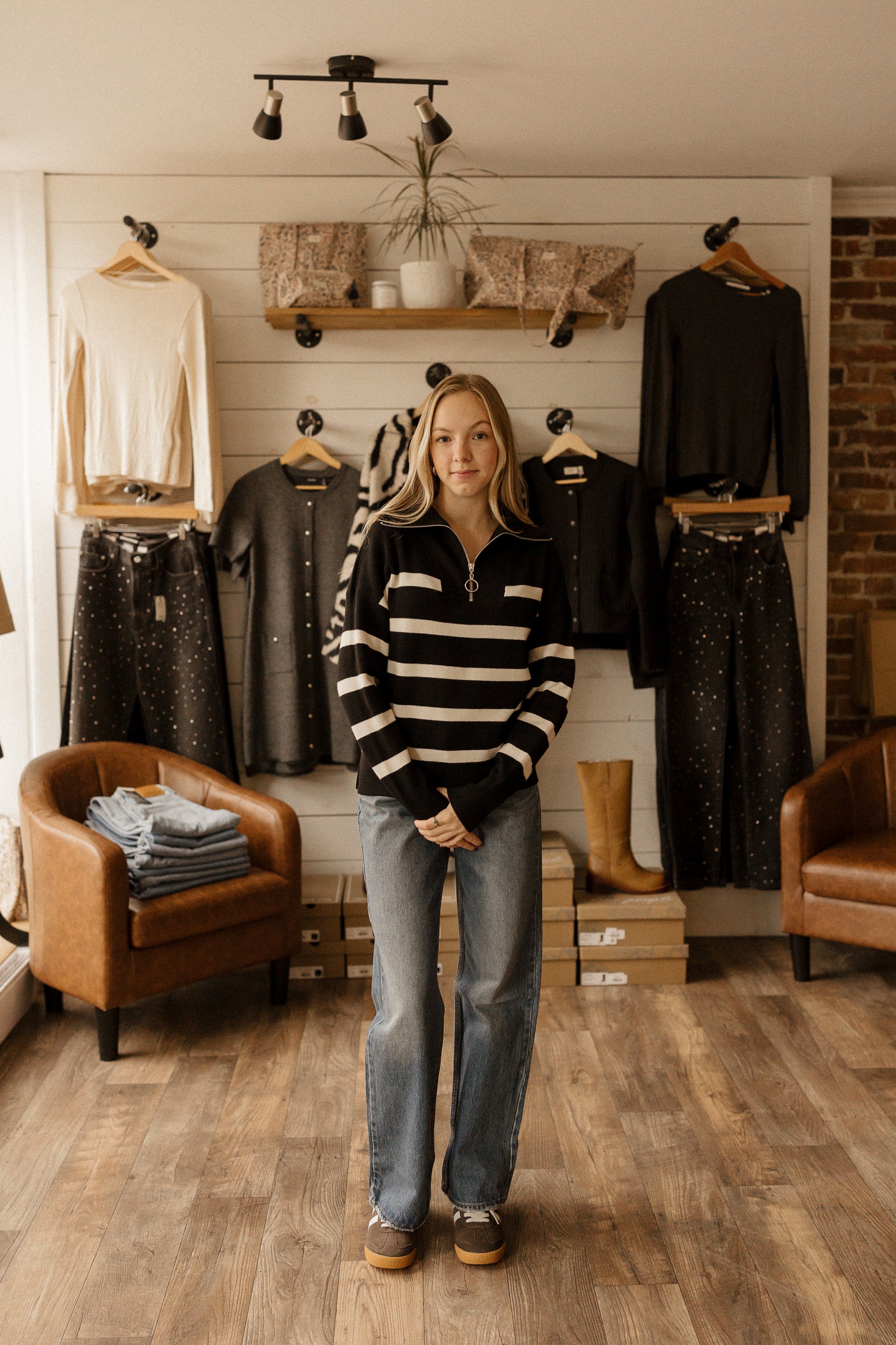 Black and white mixed striped sweater with a front quarter neck zipper.