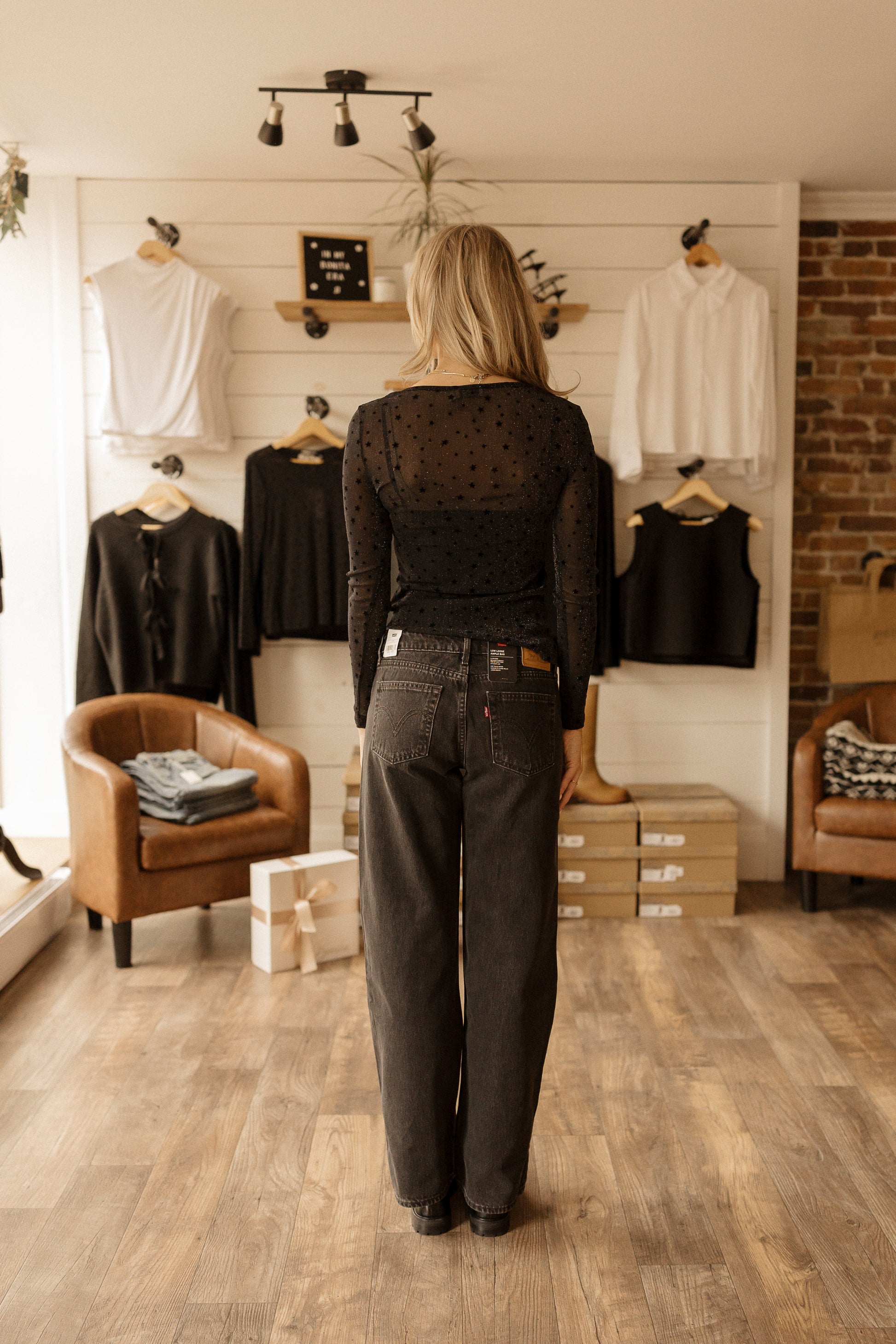 Sheer black mesh top with velvety star accents. Playful, versatile, and perfect for layering!