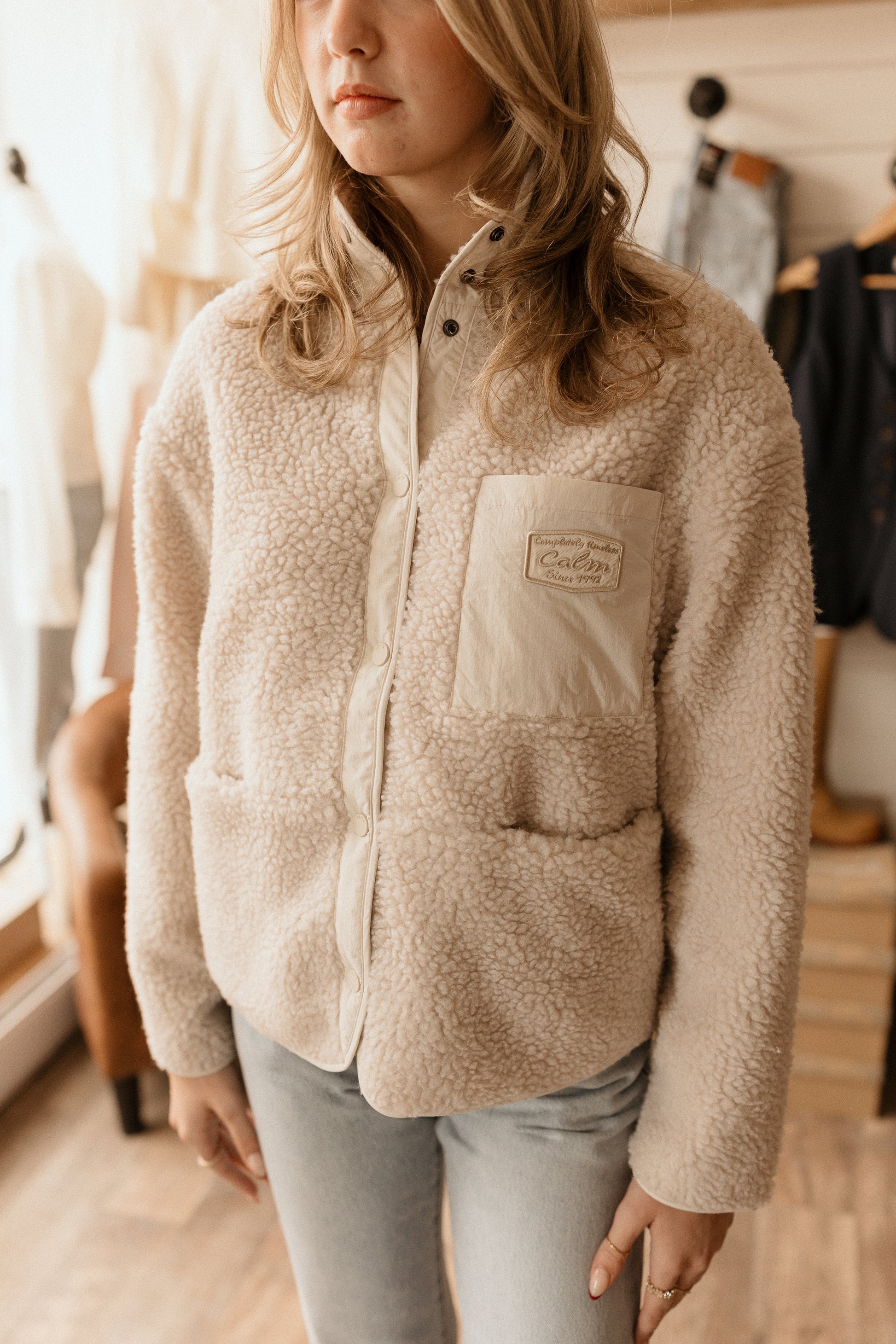 Luxe Teddy jacket with front buttons in a neutral teddy hue