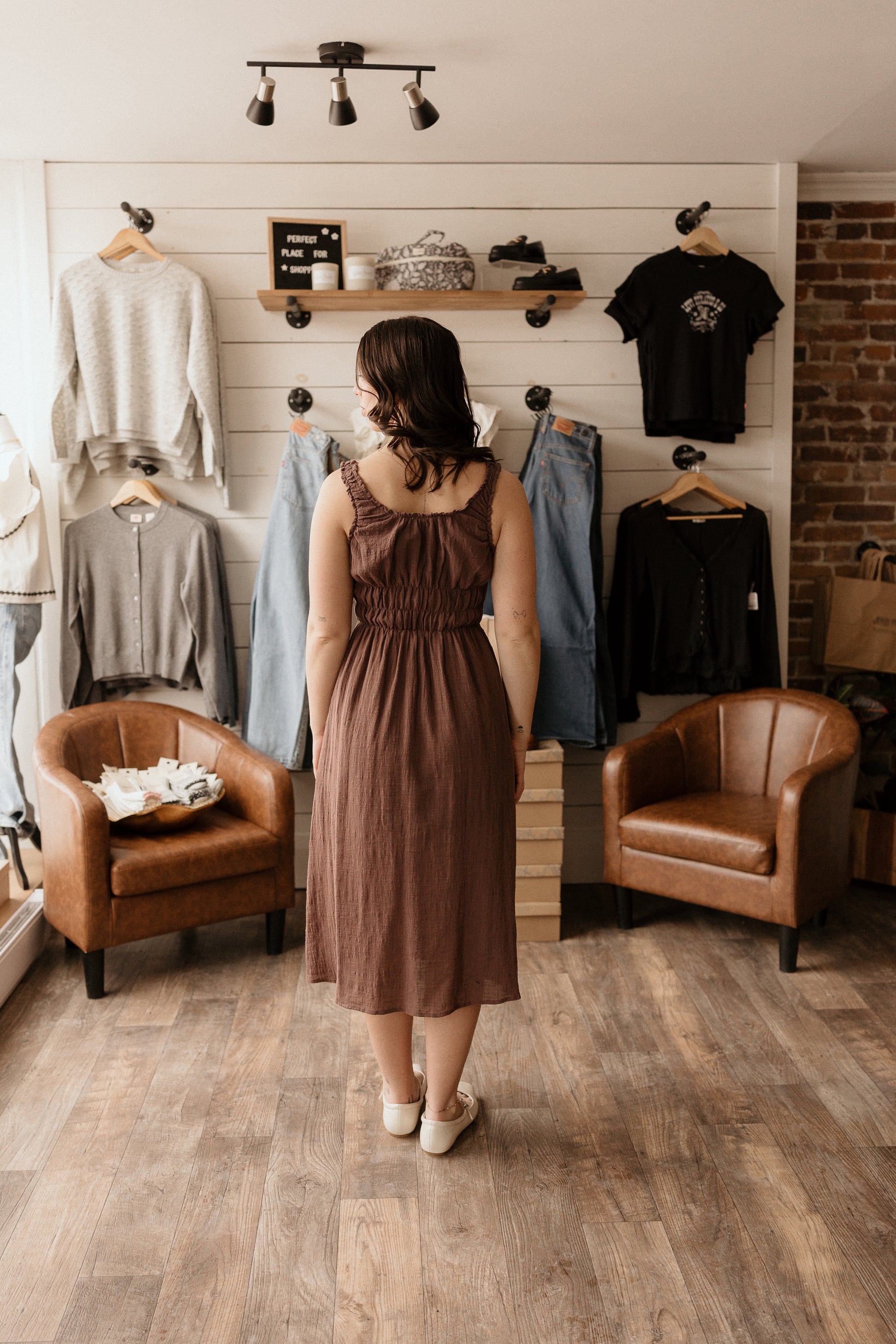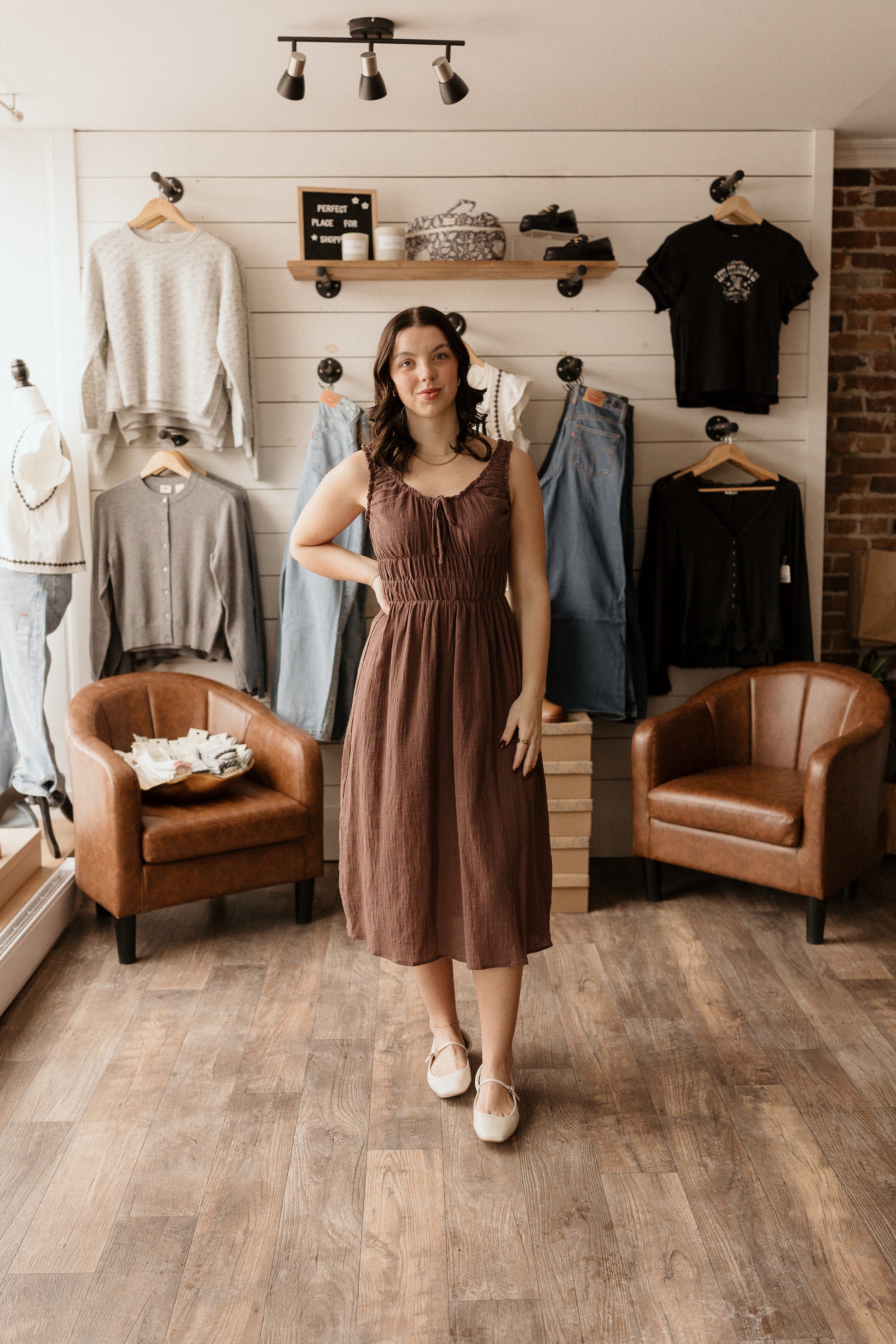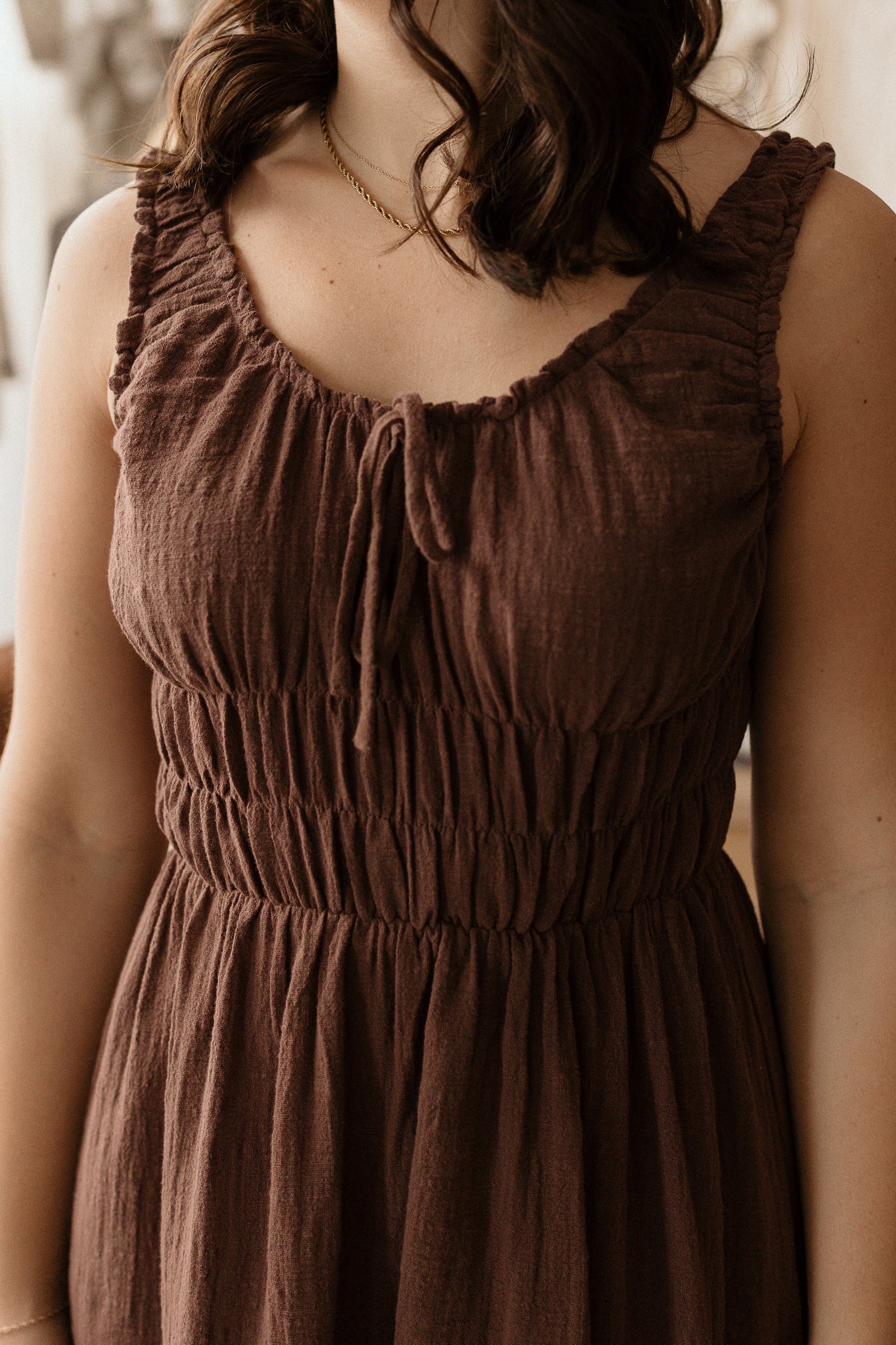 Chocolate brown midi dress with smocked detailing.